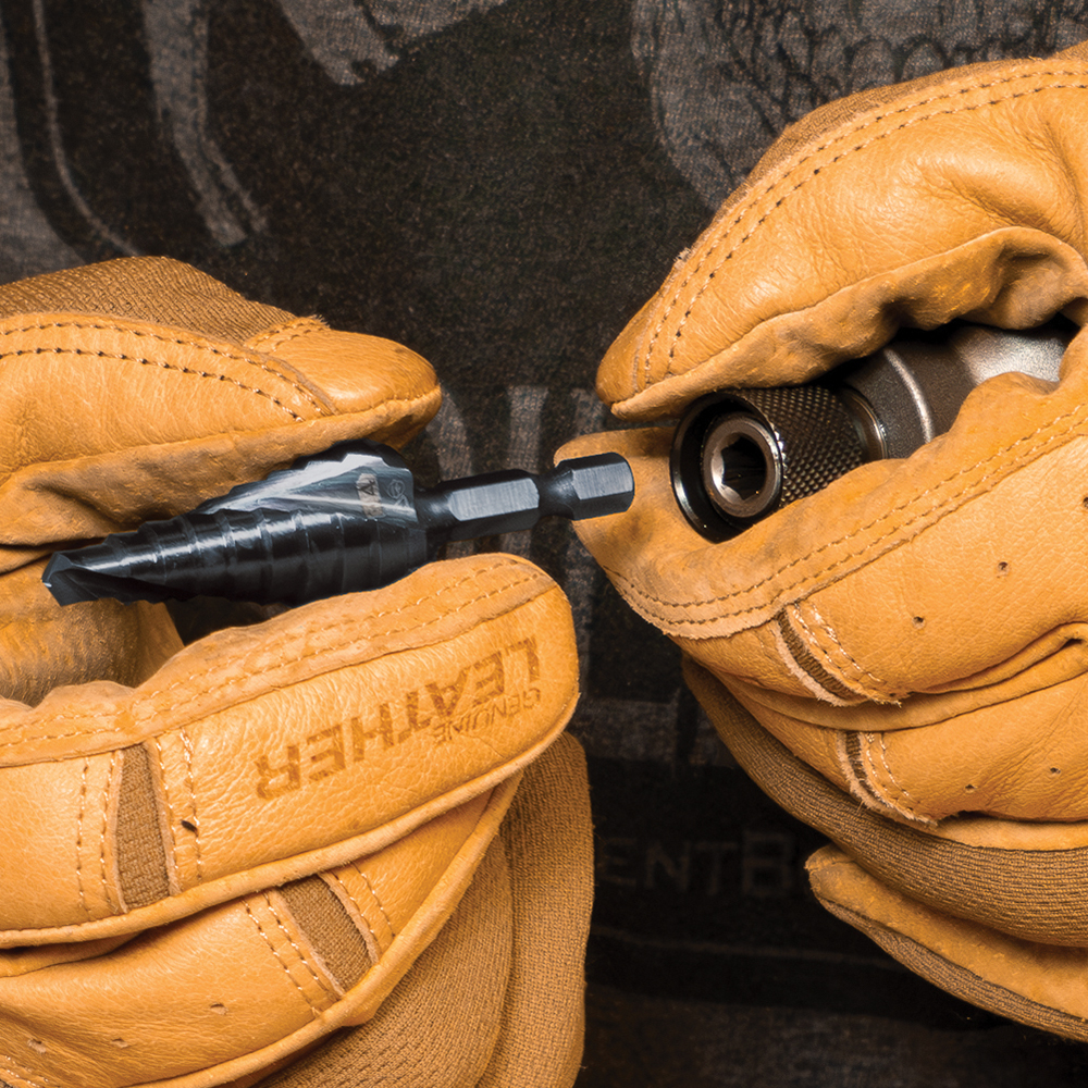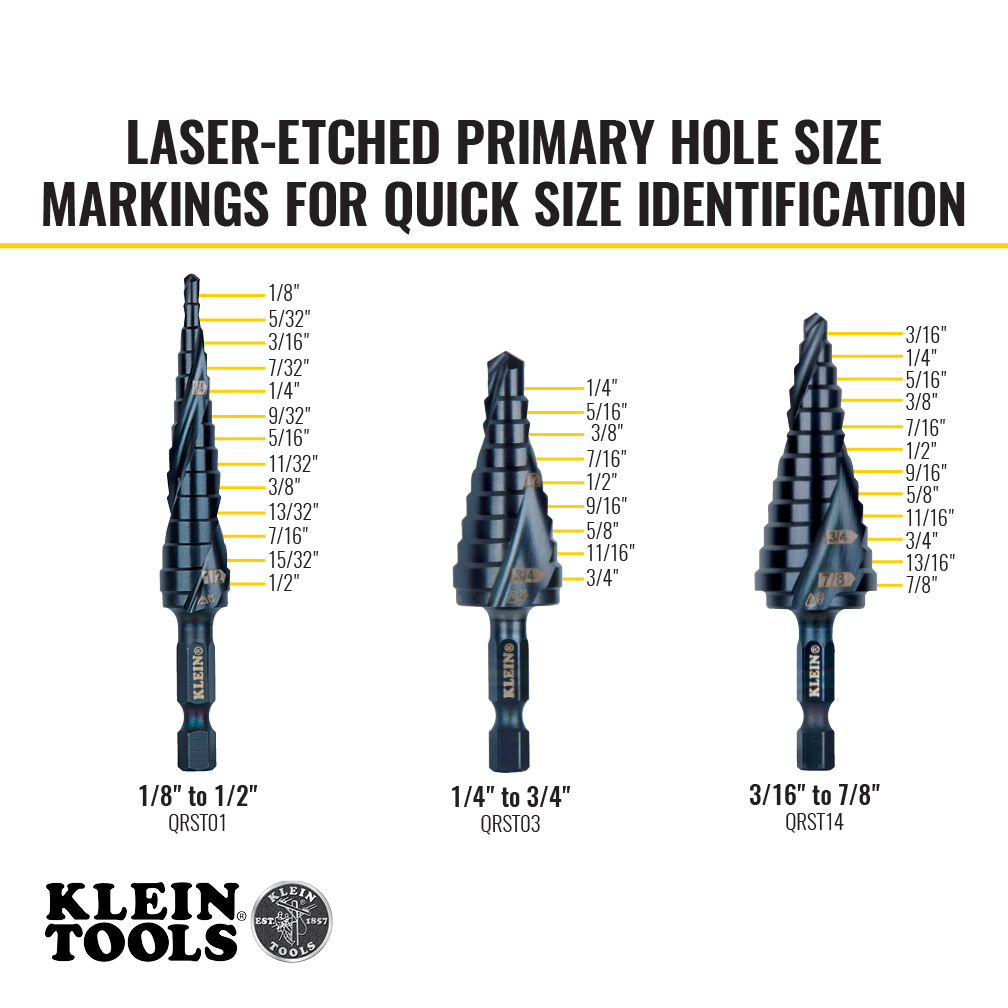 The All Purpose Quick Release Step Bit Set contains three commonly used bits sized 1/2-Inch, 3/4-Inch, and 7/8-Inch plus cutting oil/lubricant. These Dual Spiral Flutes help pull the step bit through the material for faster cutting. The aluminum titanium coating is 10 times more durable than steamed black oxide for longer bit life. Impact rated, the 1/4-Inch hex shank provides a firm, positive grip and allows quick and convenient usage with an impact driver and a drill. The compact, modular case is designed to nest neatly within MODbox™ toolboxes and on the MODbox™ Case Adapter Side Rail Attachment.