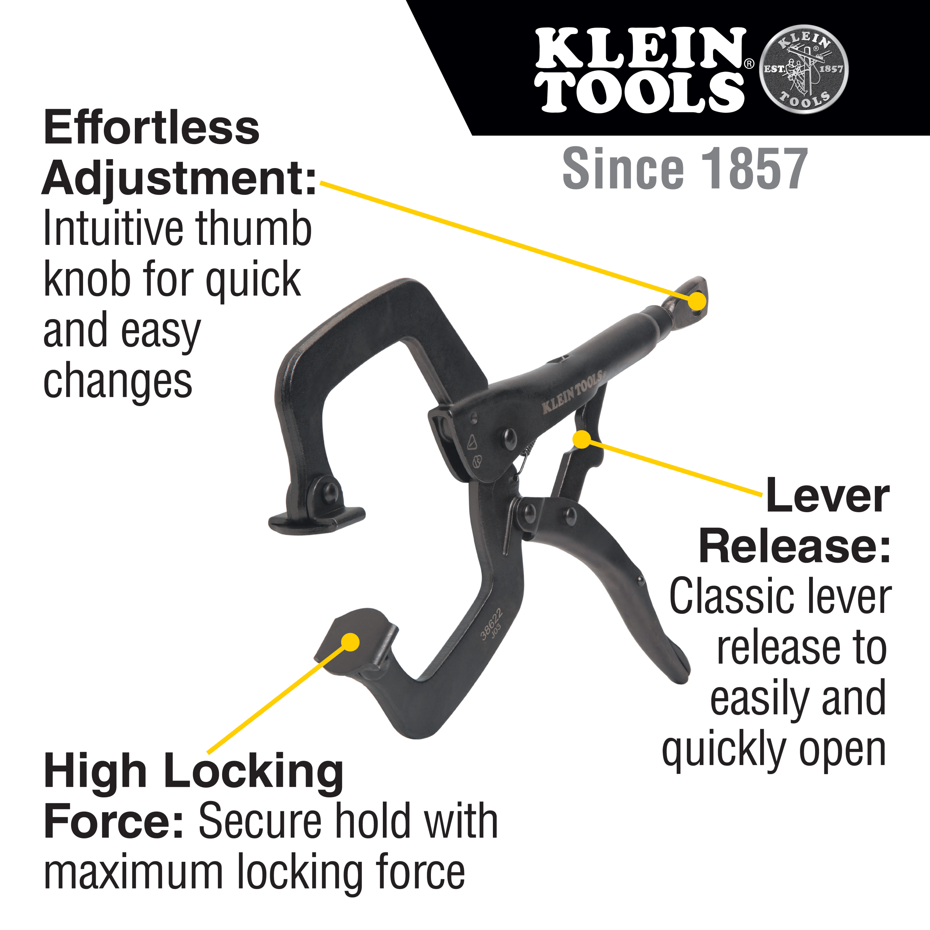 Unlock exceptional holding power with Klein Tools' 6-Inch (Cat. No. 38620) and 11-Inch (Cat. No. 38622) C-Clamp Locking Pliers With Swivel Jaws. Expertly designed for high locking force, these pliers bring toughness to your projects. The intuitive thumb knob ensures effortless and swift size adjustments, while the swivel pads ensure damage free clamping on a large variety of work surfaces.