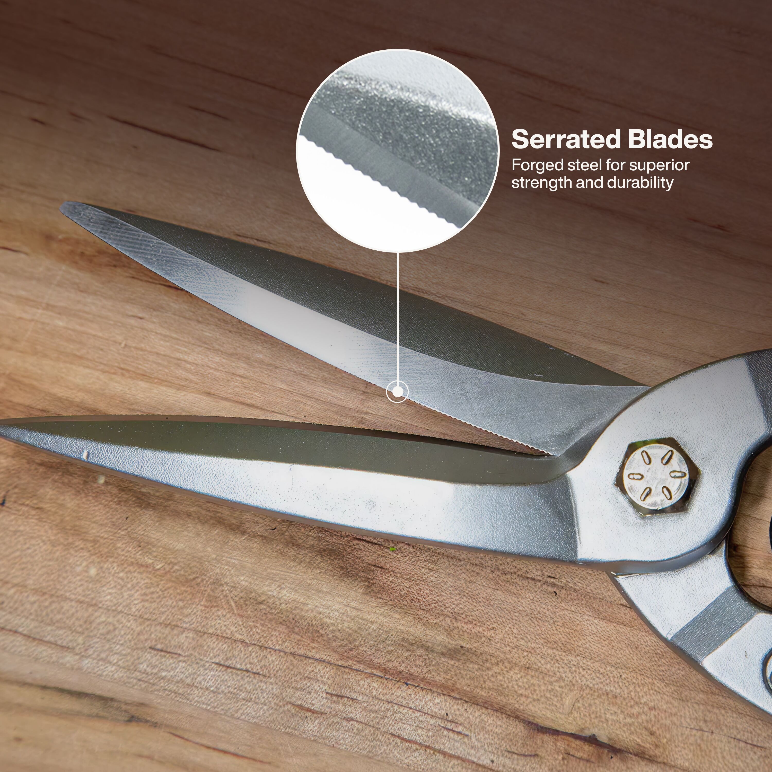 - Metal snips have serrated blades of forged steel for superior strength and durability