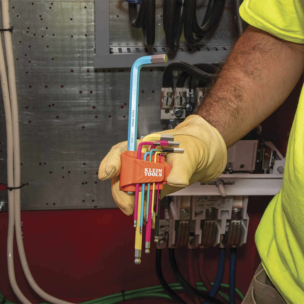 Klein Tools' 9-Key Color-Coded Hex Key Set conveniently consolidates the most popular metric sizes into one compact caddy. The industrial strength, extended reach ball-end keys are optimal for working at angles up to 25 degrees. Hex keys are conveniently stored within a cross-compatible, interlocking case for sleek and convenient storage to stack with other Twist-to-Lock cases.