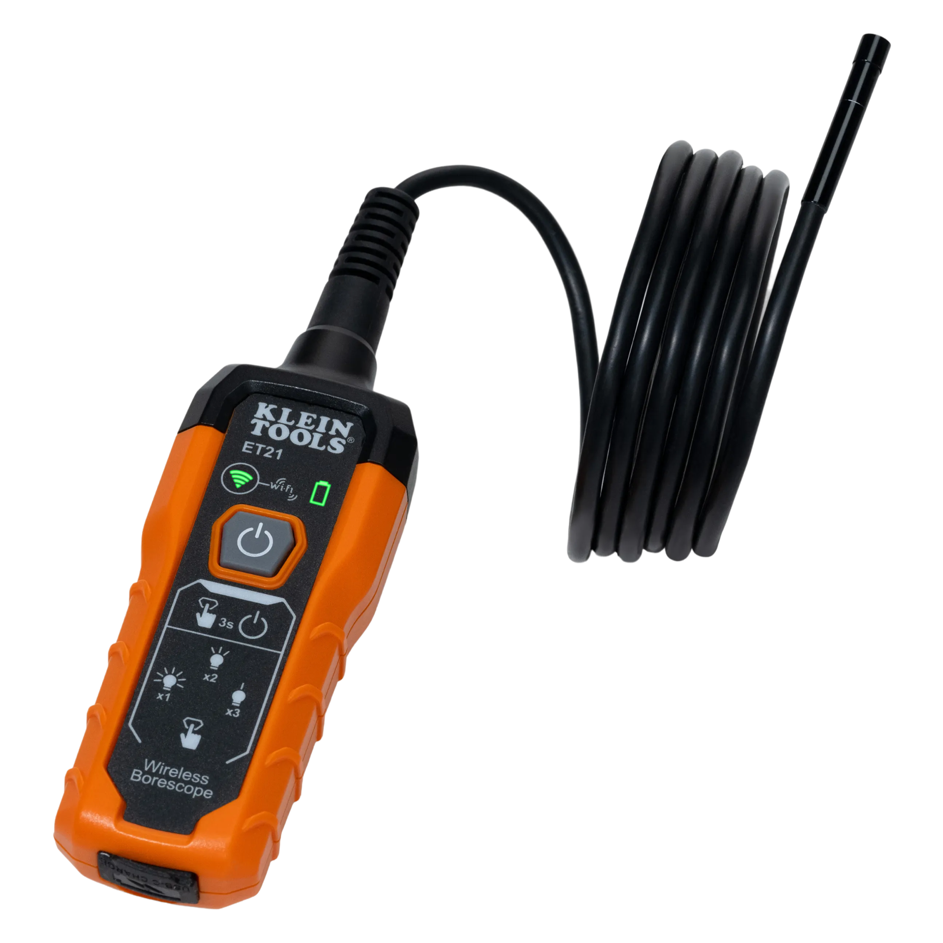 Klein Tools WiFi Borescope features a 5.5mm camera with 480p resolution for clear visual inspections. Wireless connectivity transmits to smartphones up to 30 feet. The 5-Foot IP67 waterproof camera navigates pipes, walls, and machinery while maintaining rigidity, while the adjustable LEDs illuminate dark areas. Klein Tools ET21 app enables instant viewing, saving, and sharing on iOS® and Android® devices.