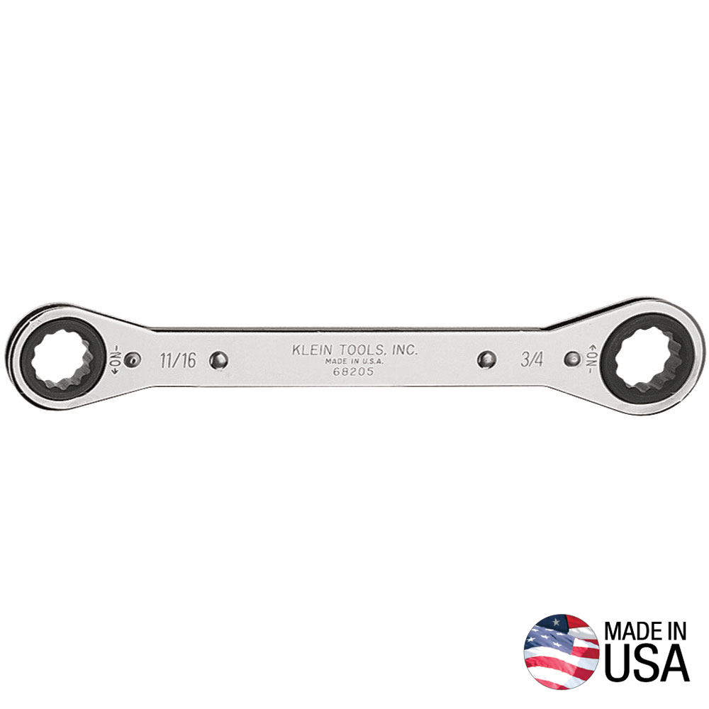 The Klein Tools Ratcheting Box Wrench is great for working in confined spaces and on long studs. This wrench has a different size opening on each end for multiple applications. Get reverse ratcheting action simply by turning the wrench over.