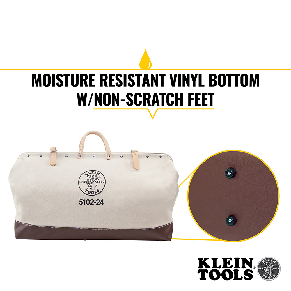 The Klein Tools 24 in. Tool Bag is constructed of heavy-duty no. 8 natural canvas and features 2 retaining straps with buckles for a secure closure. The vinyl bottom and lower sides provide extra support and moisture resistance. The non-scratch studs on the base protect against wear and the mouth has a steel frame and hinge for strength.