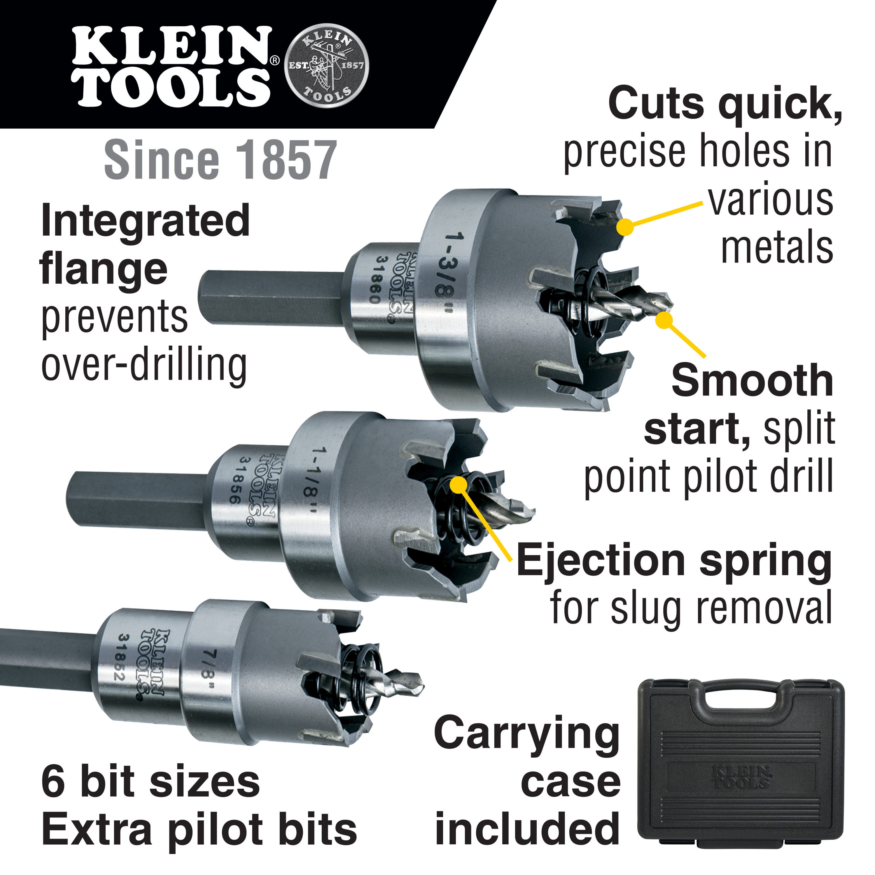 This hole cutter kit cuts quick, precise holes in a variety of materials. Includes six commonly used size plus two extra pilot bits. Integrated flange prevents the operator from drilling beyond the sheet metal. Split point pilot drill bit prevents bit walking.