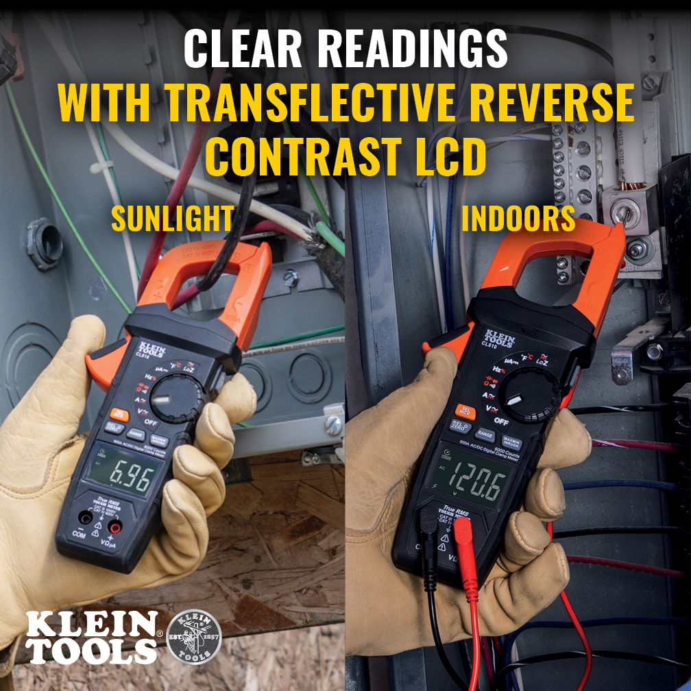 Klein Tools CL810 Clamp Meter with Flashlight delivers accurate measurements across AC/DC current, voltage, resistance, continuity, frequency, inrush, and capacitance, all with True RMS precision. It features diode testing and LoZ mode to eliminate ghost voltages. Temperature is taken via thermocouple. Features NCV detection with escalating audio-visual alert. The transflective reverse-contrast display and lighted dial ensure visibility in any lighting; a reliable tool for diverse applications.