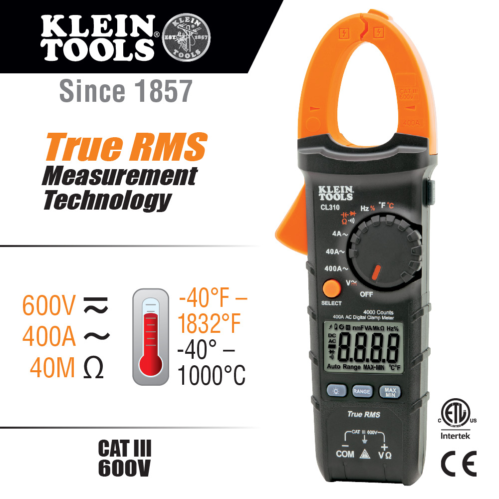 Klein Tools CL310 is an automatically ranging true mean squared (TRMS) digital clamp meter that measures AC current via the clamp, AC/DC voltage, resistance, continuity, frequency, capacitance, and diodes via test-leads, and temperature via a thermocouple probe. It is no longer in production. Please refer to the CL312 as an equivalent replacement.