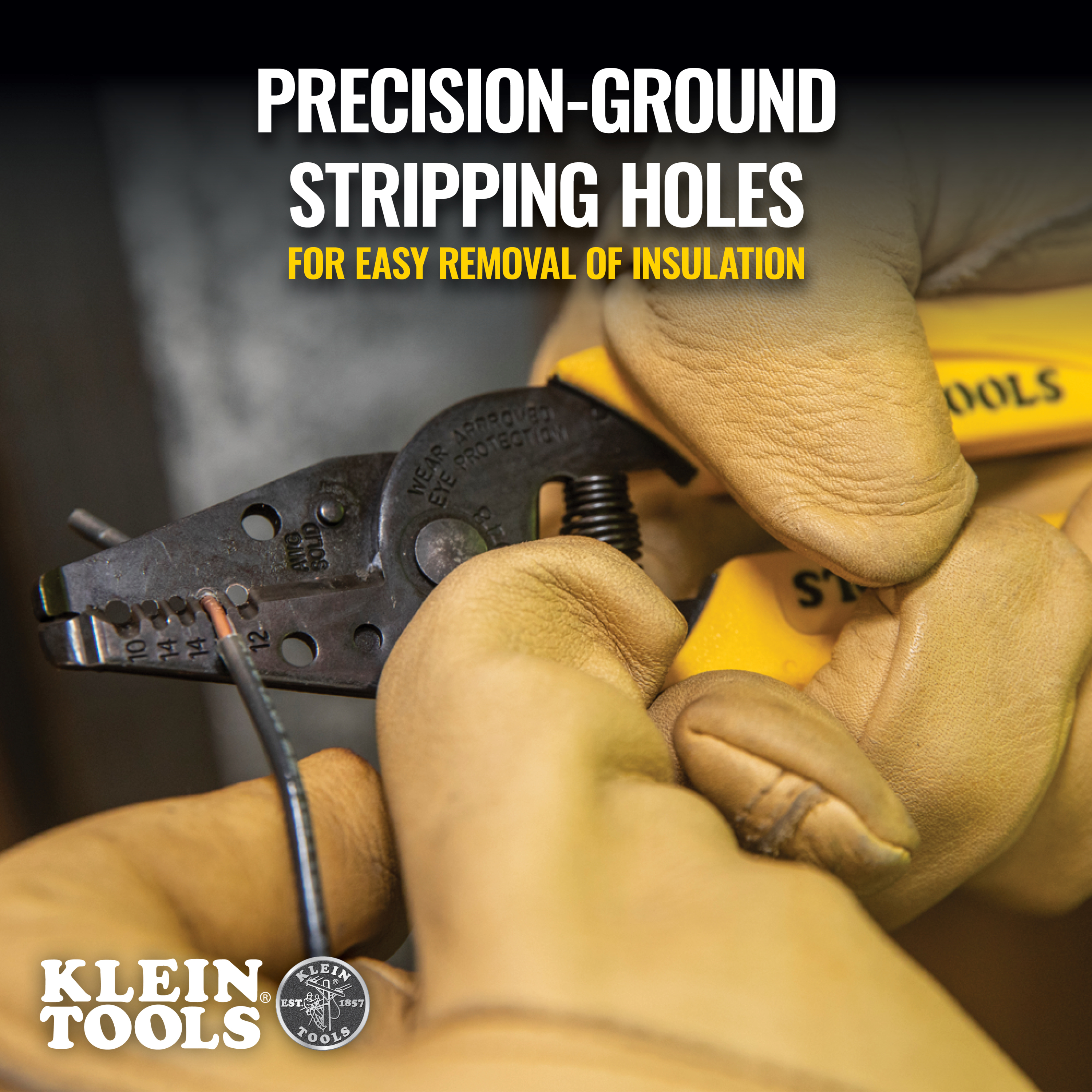 Complete electrical wiring tasks quicker by stripping 2 wires at a time with the Klein Tools 6-1/4-Inch Dual-Wire Stripper/Cutter. This tool is designed for use with 10-14 AWG solid wire. Its precision-ground stripping holes cleanly cut wire and aid in easy removal of insulation.