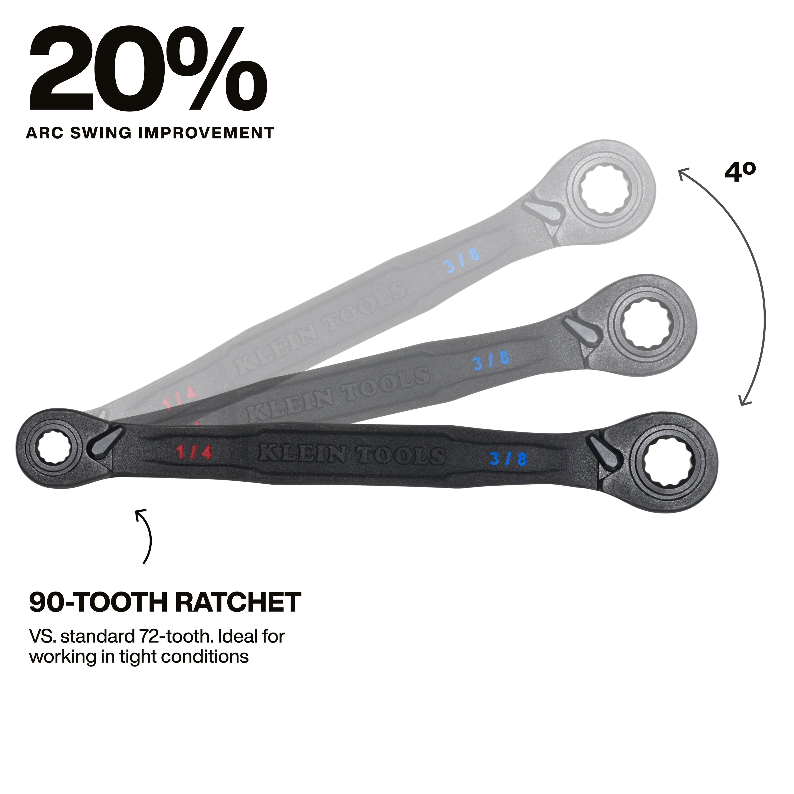 - 90-tooth ratchet mechanism minimizes arc swing for maximum access in tight spaces