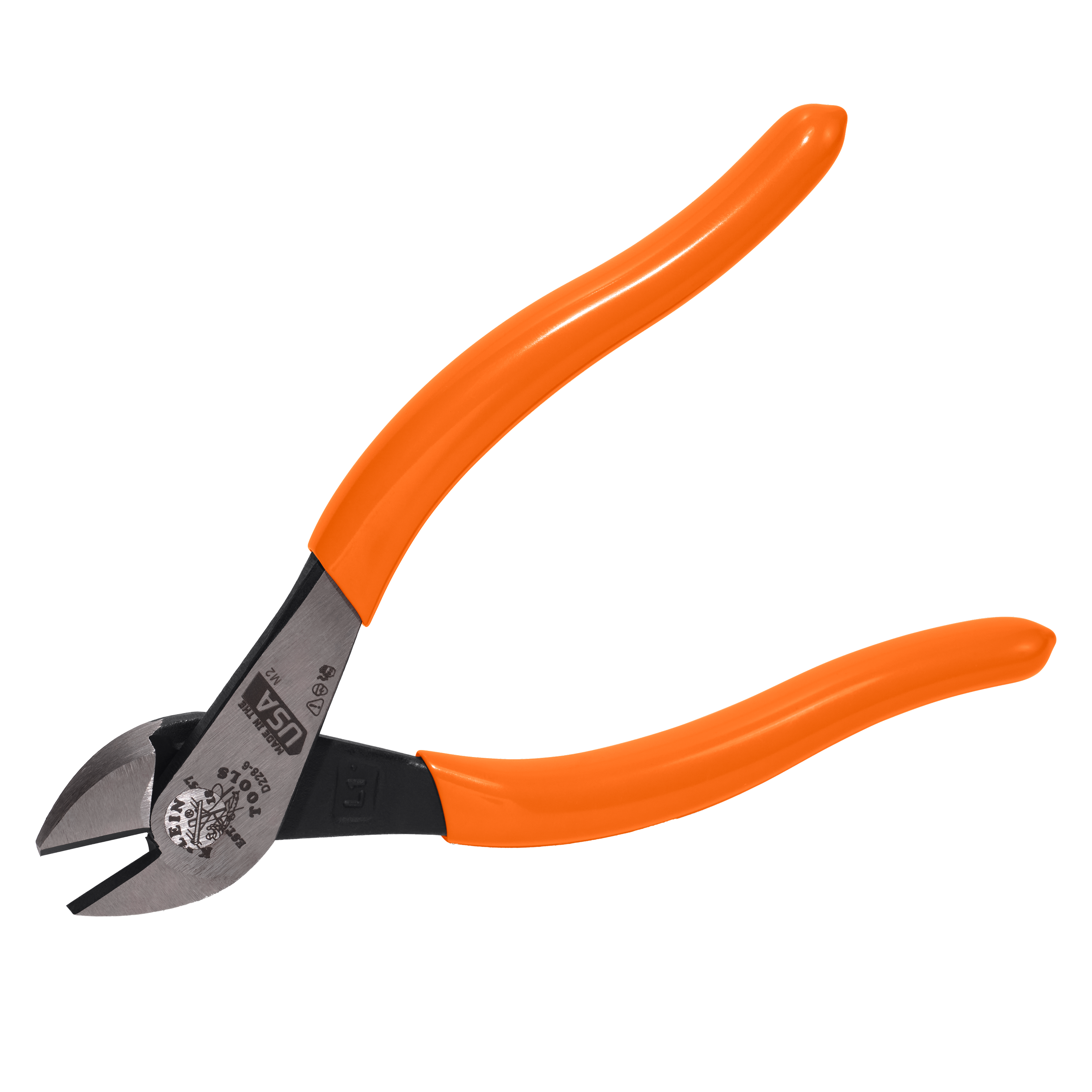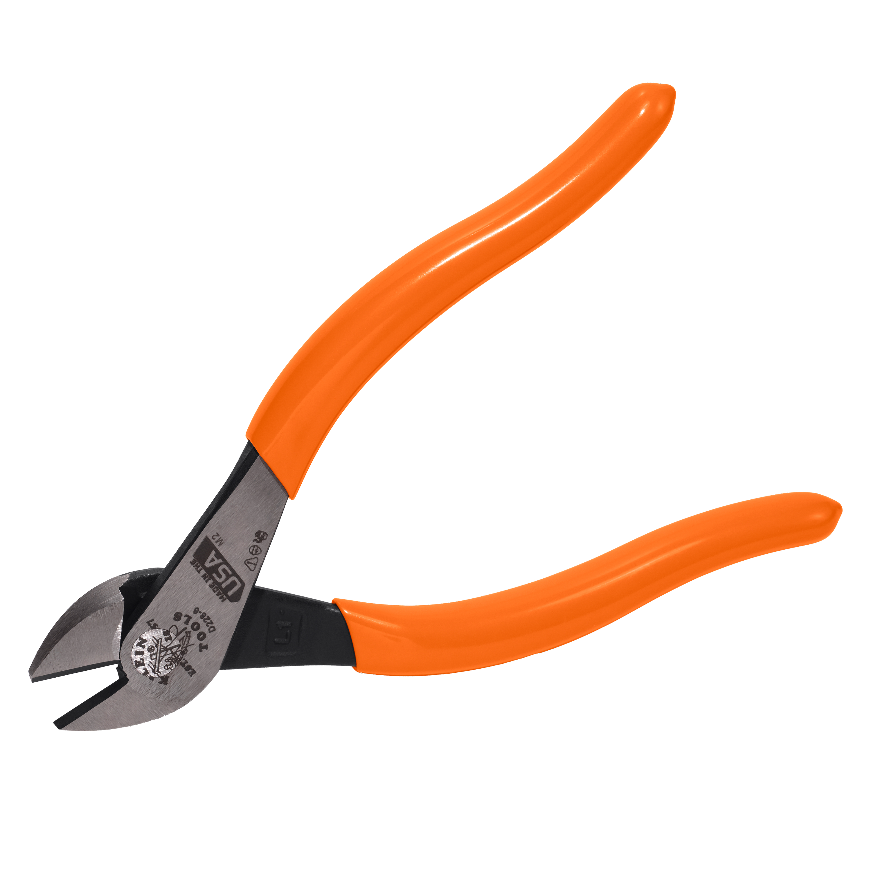 Klein Tools 6-Inch Diagonal Cutting Pliers feature a high-leverage design providing 36-Percent greater cutting power than other pliers. Short jaws with beveled cutting edges permit close cutting of wire. The hot riveted joint ensures smooth action with no handle wobble. Laser-hardened blades provide extended durability and cutting ability. Bright colored plastic dipped handles offer comfort and ease of identification. Made in the USA with custom US-made steel.