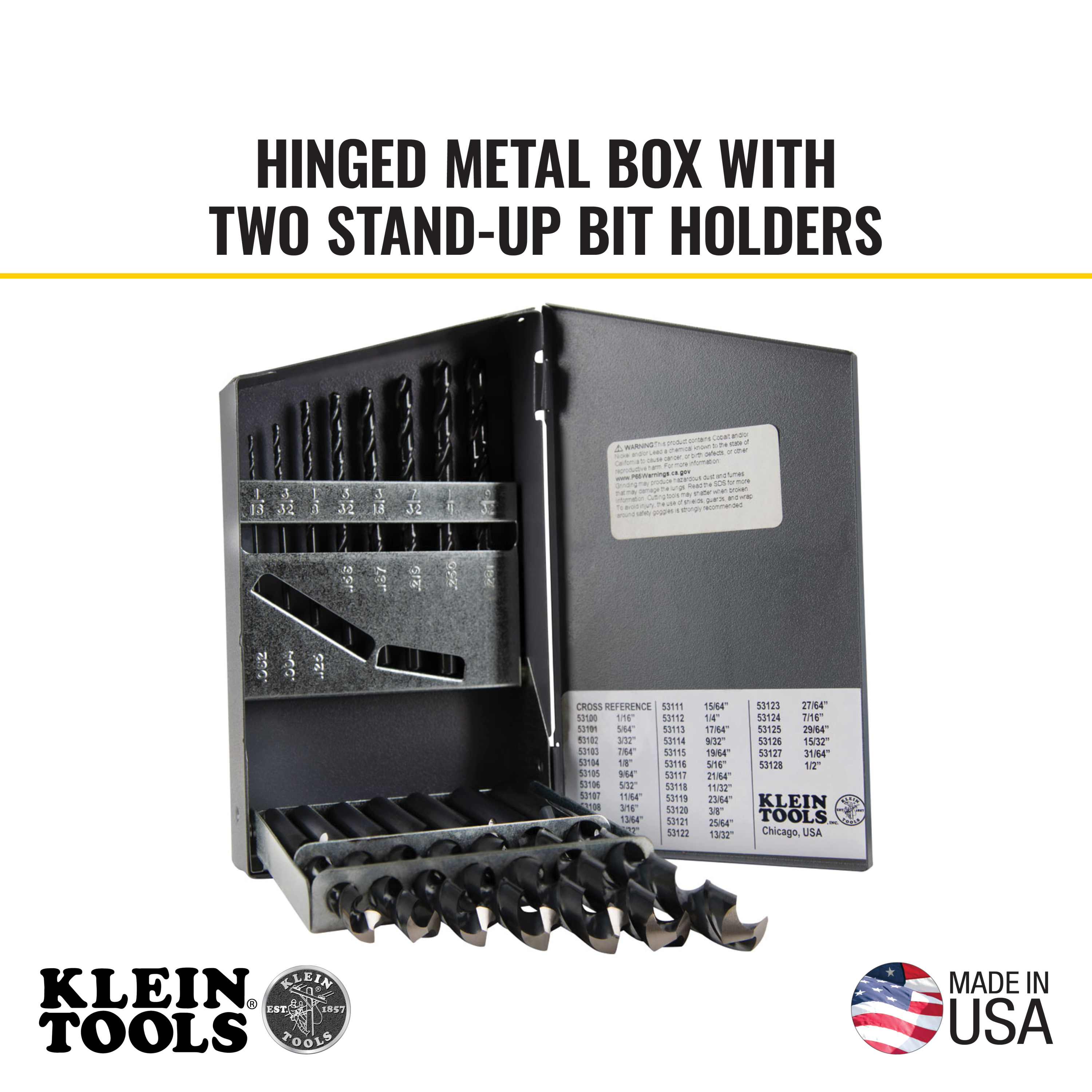 - Hinged metal box with two stand-up bit holders