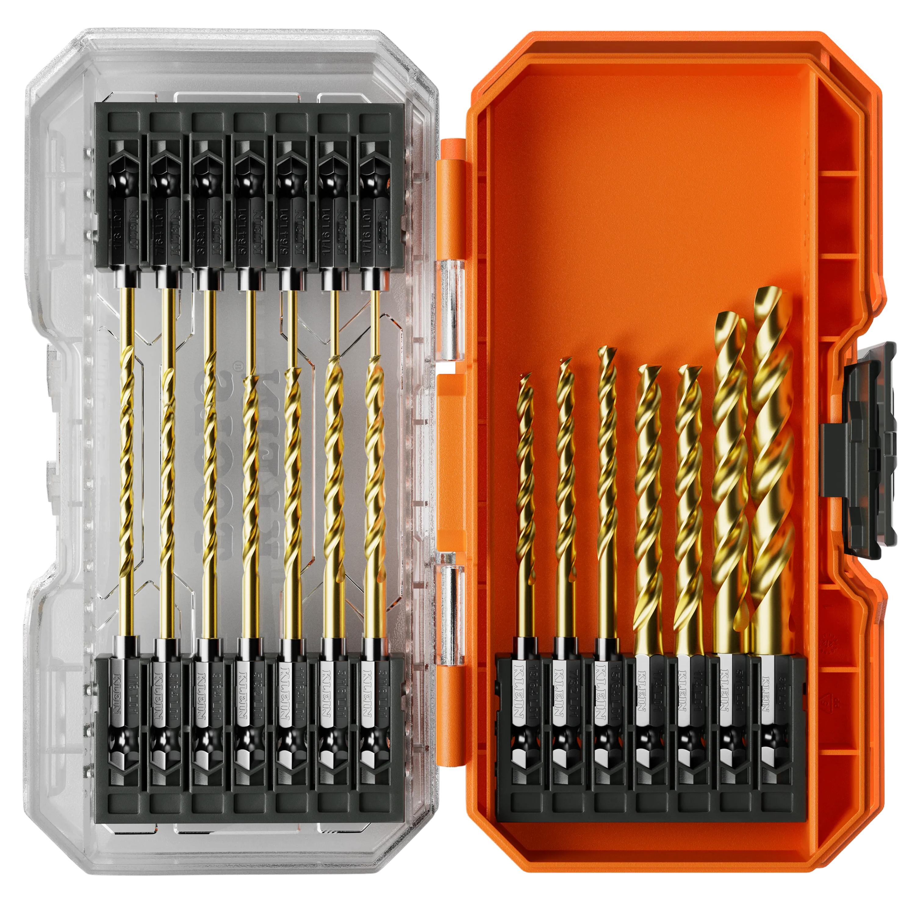 - 21-Piece drill bit set includes sizes: (2) 1/16, (2) 5/64, 3/32, 7/64, (2) 1/8, (2) 9/64, 5/32, 11/64, (2) 3/16, 13/64, 7/32, 15/64, (2) 1/4, 5/16, 3/8-Inch drill bits
