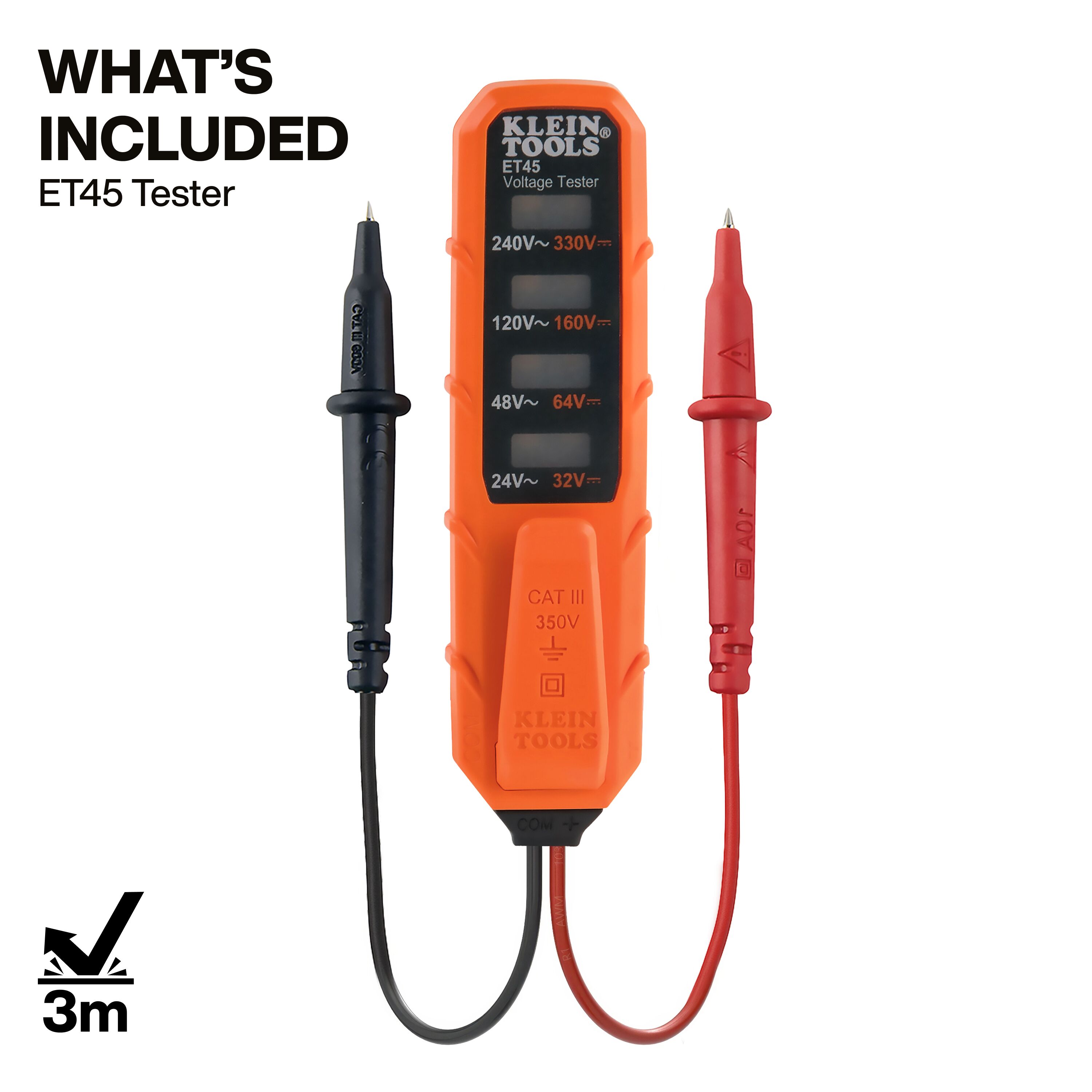 Klein Tools ET45 is an Electronic Voltage Tester. Designed as a simple, easy to use tester to check, verify or troubleshoot common residential electrical wiring in electrical outlets, light fixtures, doorbells and more. This tester does not require batteries, and features a pocket clip for convenient carrying.