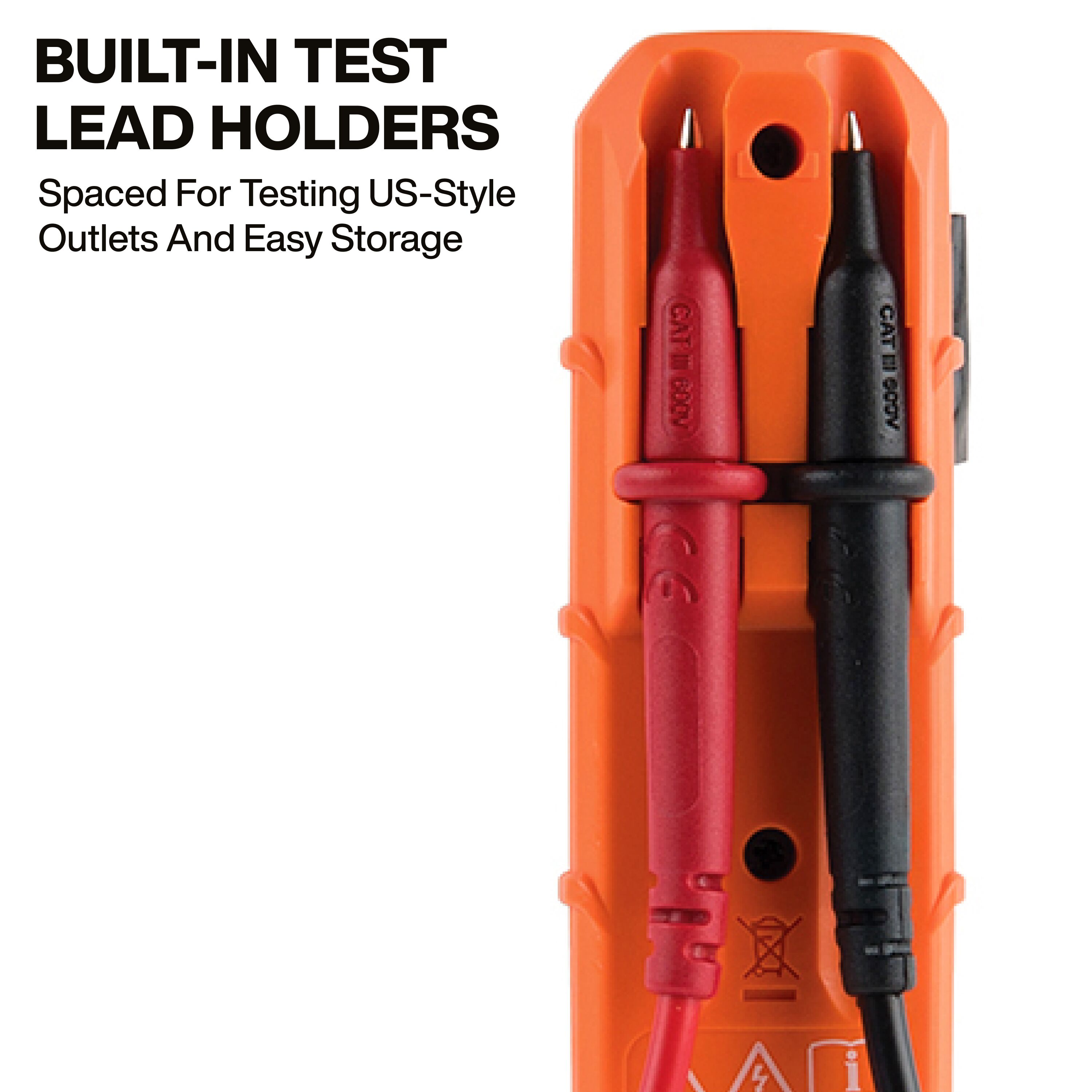 Built-in Test Lead Holders on Back of Tester Spaced Correctly to Hold Leads for Testing Tamper-Resistant US-style Outlets