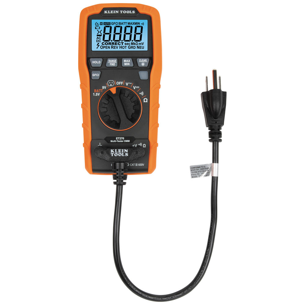 Klein Tools' ET270 is an auto-ranging digital multi-tester that measures AC/DC voltage, resistance, continuity, and performs a battery test. It also tests wiring conditions in standard 120VAC and GFCI electrical receptacles and inspects North American GFCI devices. Comes with Right-Angle Test Leads, Receptacle Test Cord, Instructions, and all required batteries.