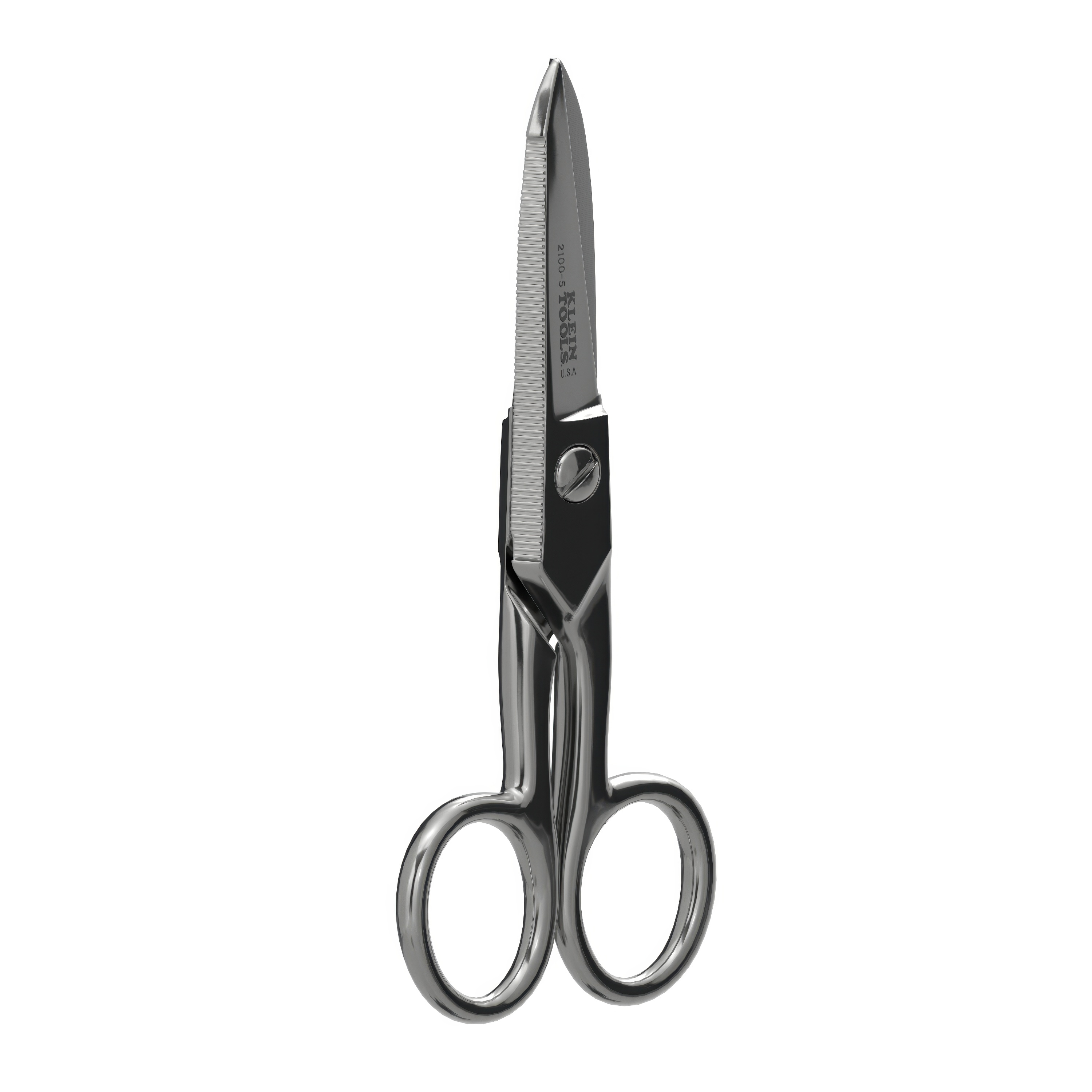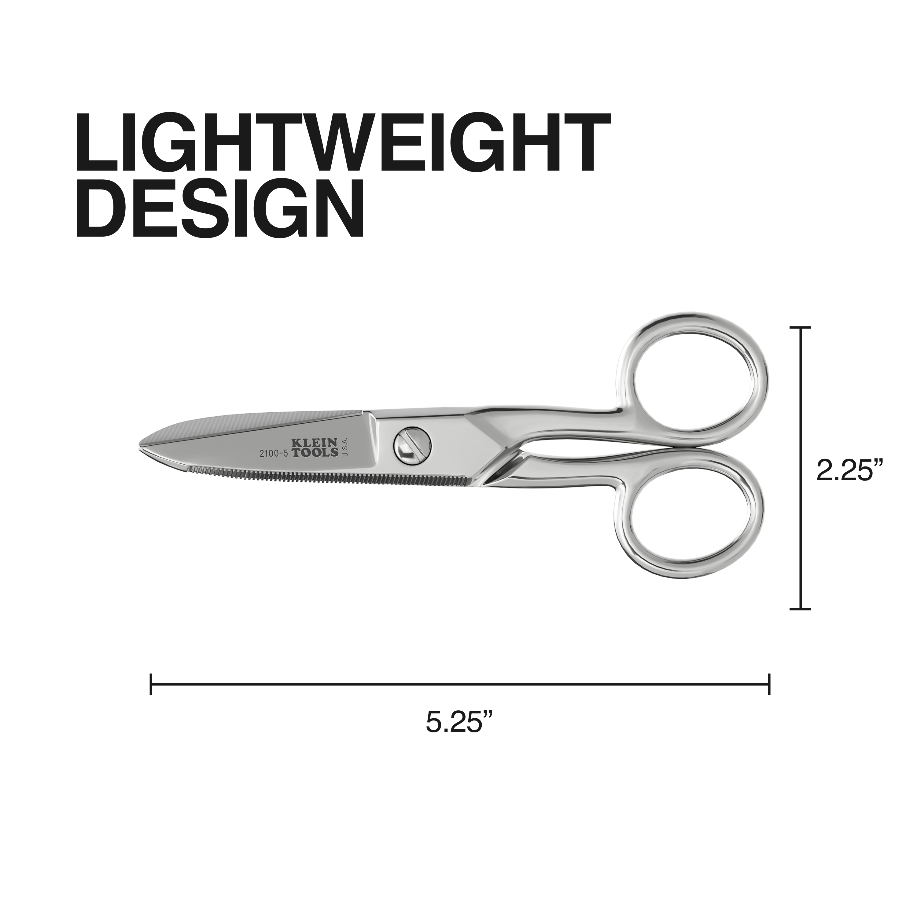 The Klein Tools 2100-5 Electrician Scissors are perfect for heavy-duty use applications. These scissors are made from durable steel with a corrosion-resistant nickel-plated finish for reliable performance. Made in the USA with a commitment to quality.