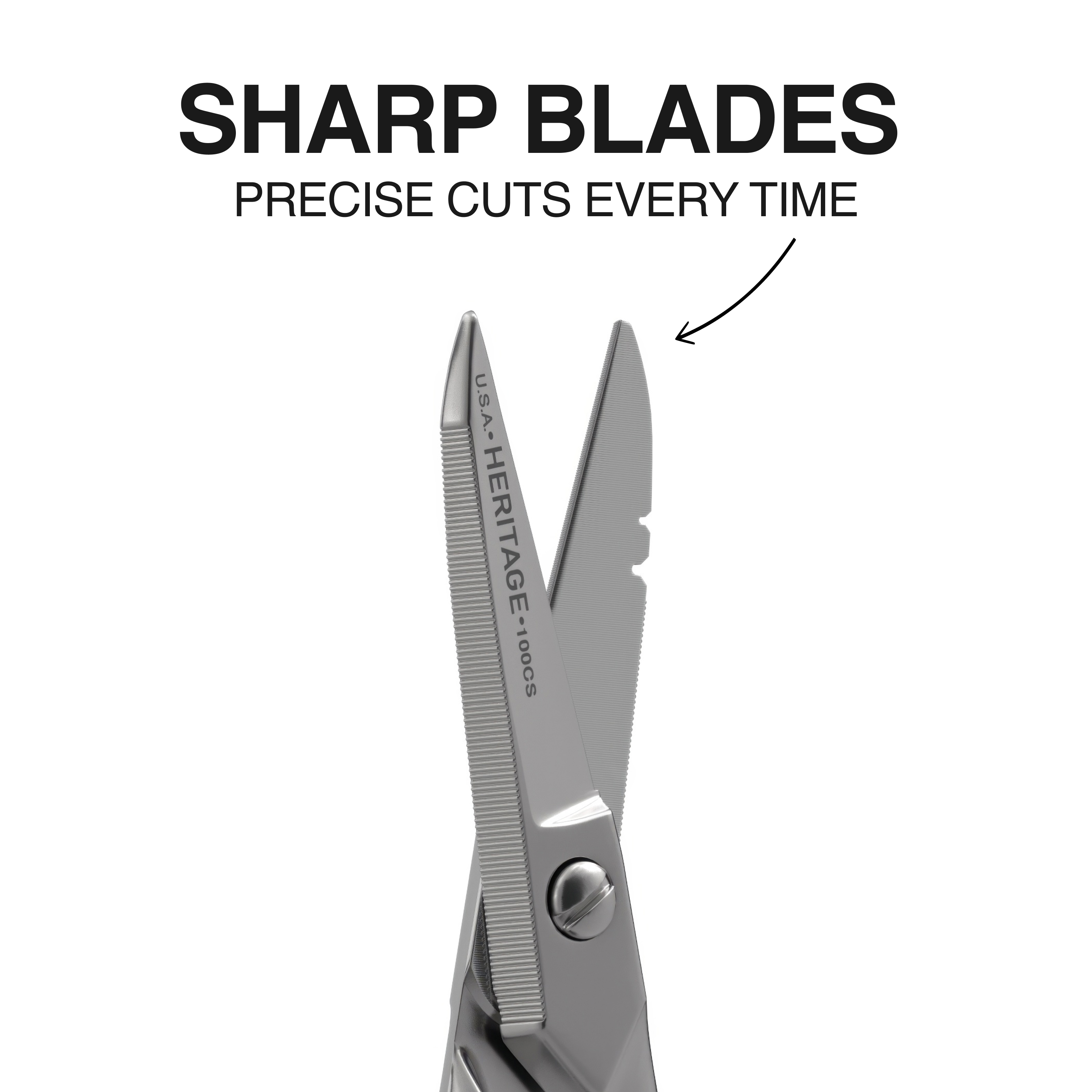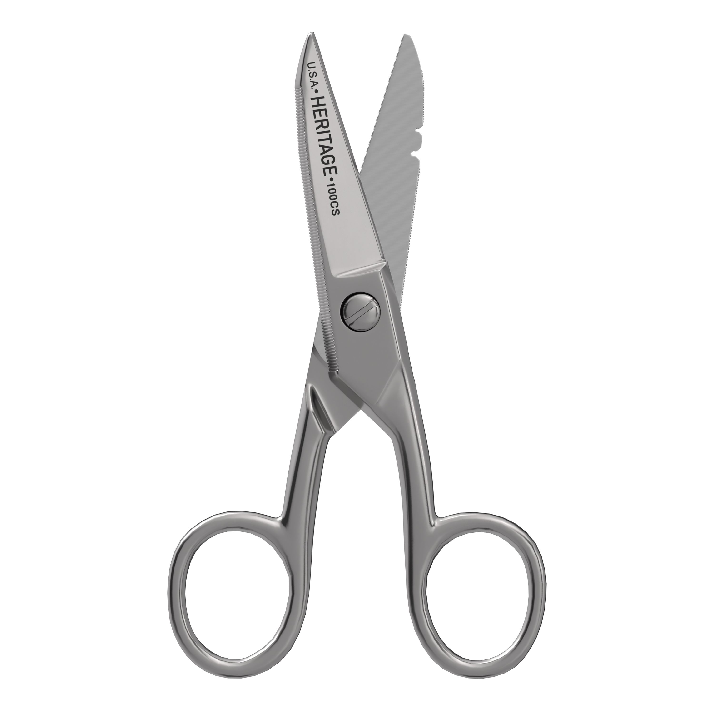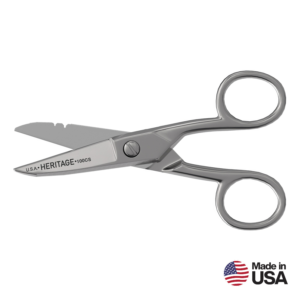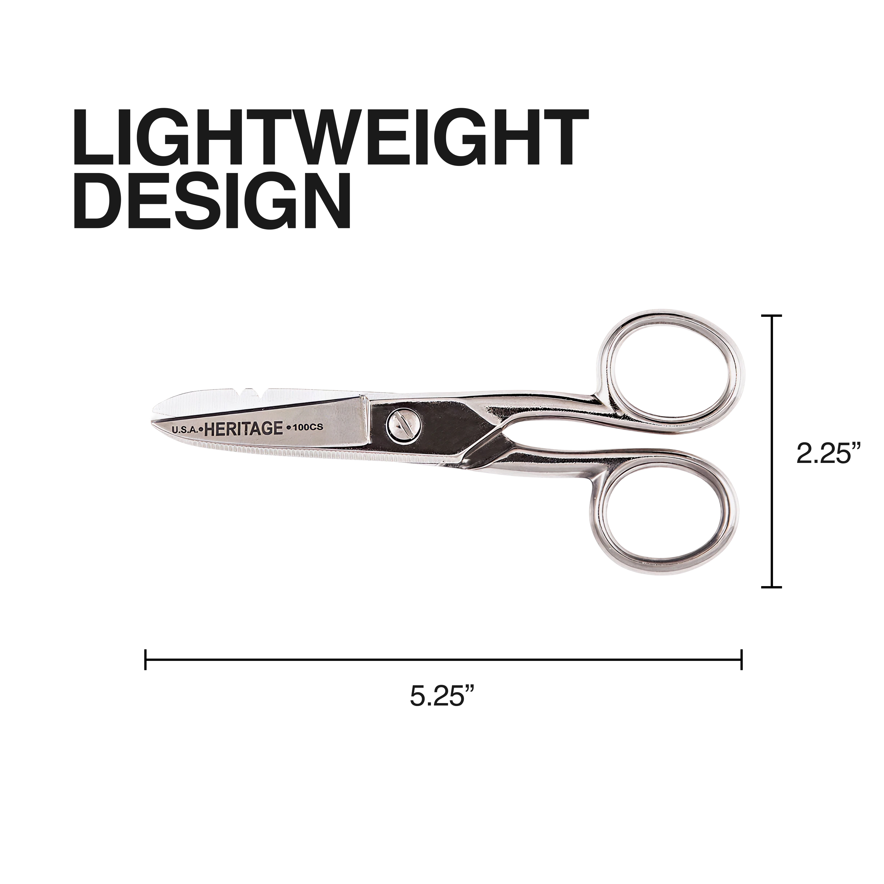 The Heritage Cutlery by Klein Tools 100CS All-Purpose Electrician Scissors are perfect for professional and home projects. They are nickel-plated for corrosion resistance and feature a wire stripper for 19 and 23 gauge wire. In addition, the ambidextrous handles ensure comfort for both left- and right-handed users. The 100CS scissors are made with quality materials in the USA.