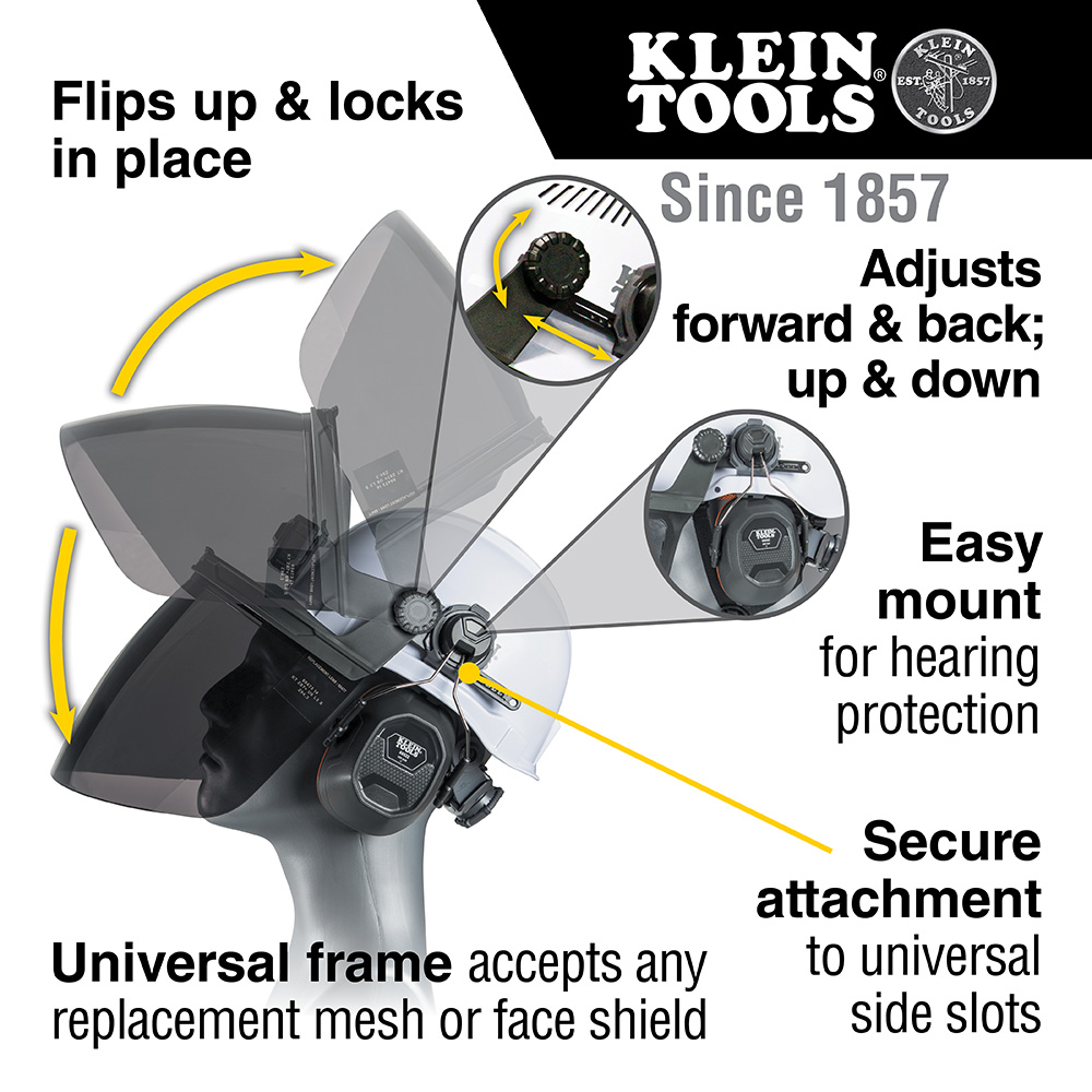 - Face Shield universally mounts to the side slots found on both Klein Tools and competitive products