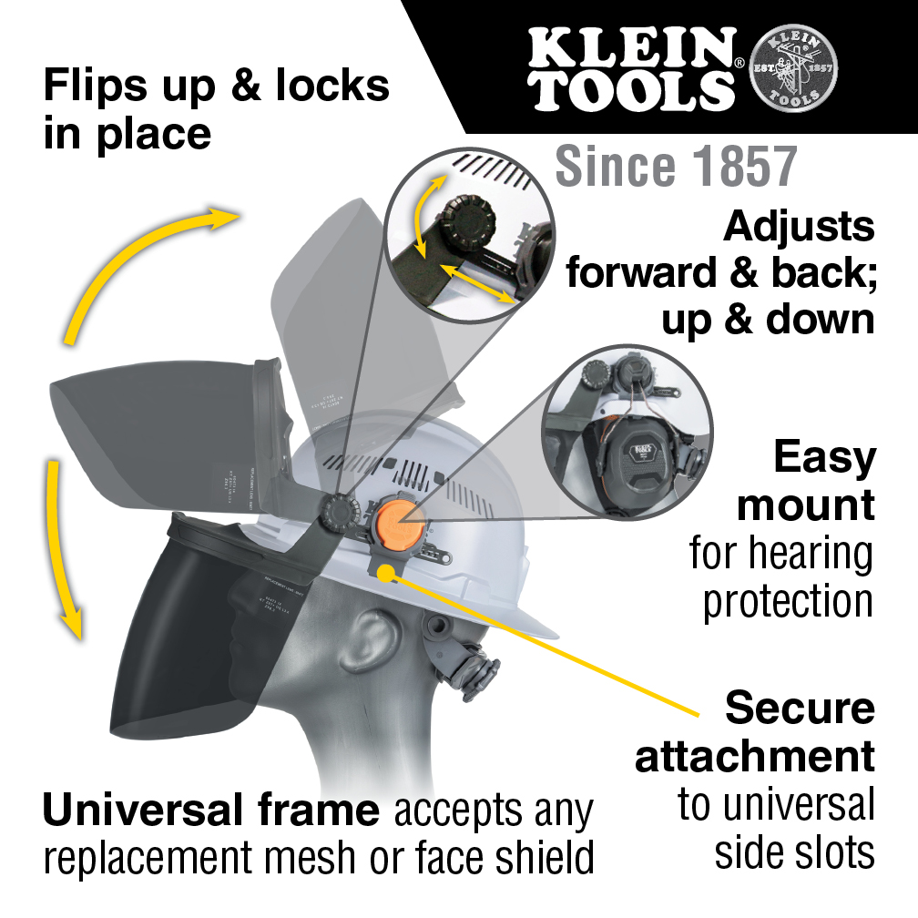 • Face Shield universally mounts to the side slots found on both Klein Tools and competitive products