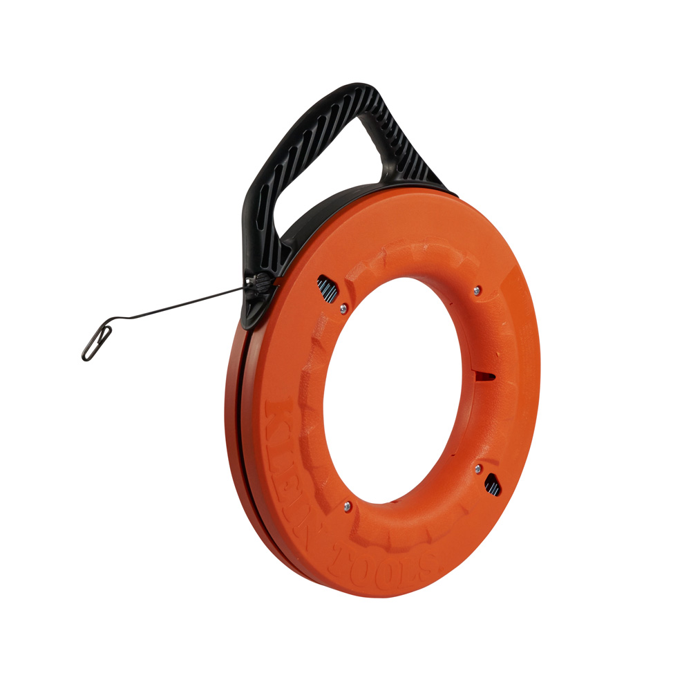 This Klein Tools 1/8-Inch Wide 240-Foot Steel Fish Tape has a high strength spring for long runs and heavy duty pulls. The tape has laser etched markings in 1-foot (0.3 m) increments to allow more accurate depth measurements. It is equipped with an angled handle and raised fingertips to transfer 100-percent of the winding power from your hands and fingers.