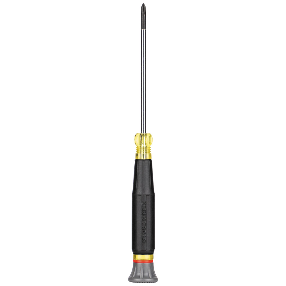 Designed for precision work, Klein's electronics screwdriver features a rotating cap for optimum control. Made of the highest quality tempered steel, carefully heat-treated for maximum strength, and precision ground to fit screw openings securely. Rotating cap and Klein's exclusive Cushion-Grip™ handle offers outstanding comfort and control.