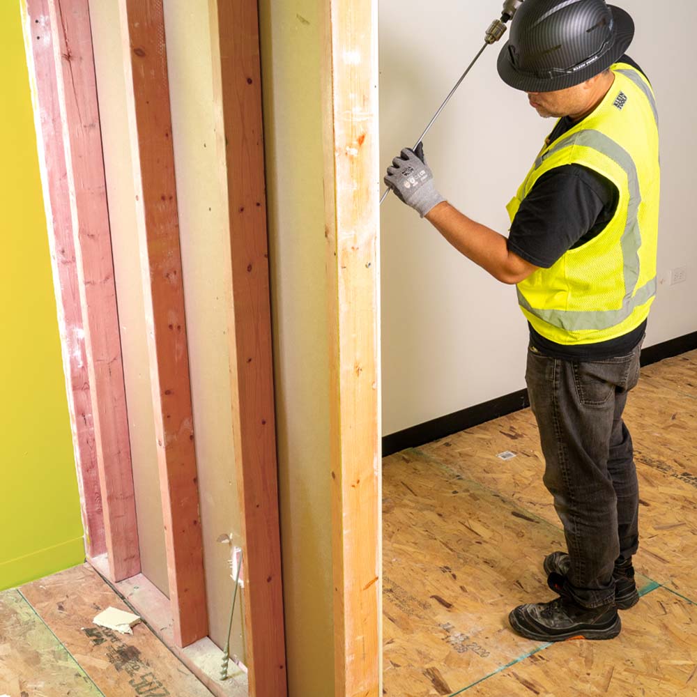 The Klein Flex Bit Auger is used to drill holes through wood within a wall. The screw point tip pulls the bit through wood. A convenient hole in the tip allows for use with wire or cable pulling grips.
