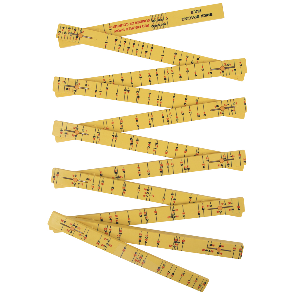 Klein Tools' 6-Foot Brick Fiberglass Folding Ruler is constructed of tough nylon, reinforced with glass fibers for added durability, and resistance to weather, abrasion, and most chemicals. Inch measurements are marked on both edges of the outside faces of the rulers, graduated to 1/16-Inch (1.6 mm). Standard brick scale measurements are marked on the inside faces of the rulers. Graduations are engraved on both sides with brick scale units on the other side for versatility.