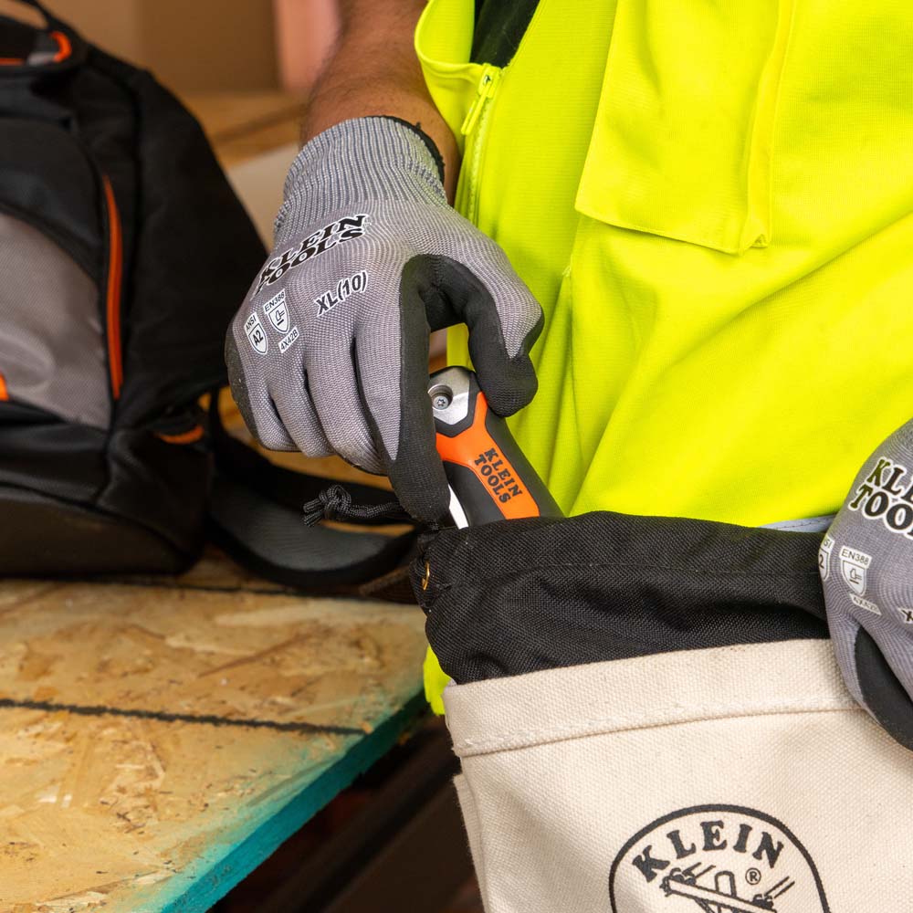 Stay safe from rips or tears in your tool pouch with Klein Tools' Folding Insulation Cutter. The serrated stainless steel blade cuts through foam and fiberglass with ease, and folds back into the comfort-grip handle for added protection. The lockback mechanism secures the blade open for heavy duty use and stable cutting. After the job is done, you can easily fold the blade back down, even with work gloves on.