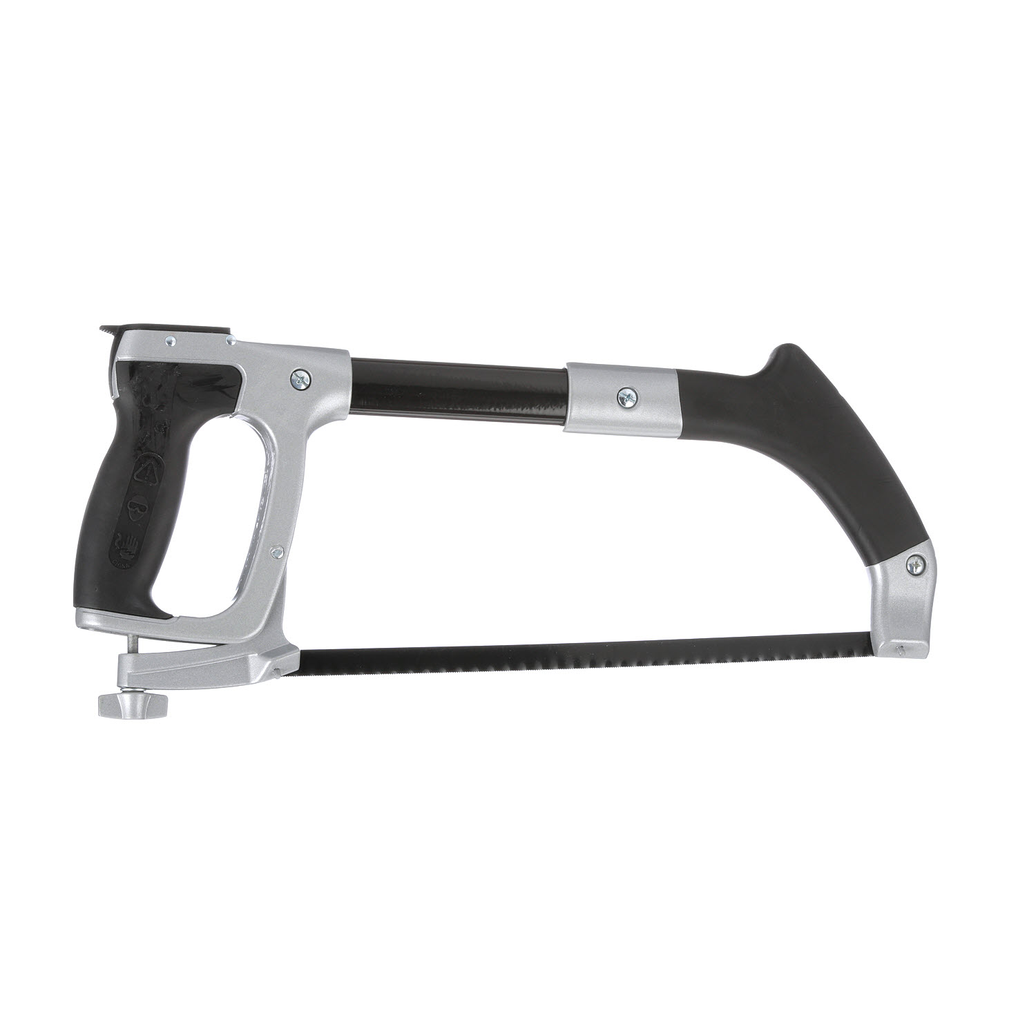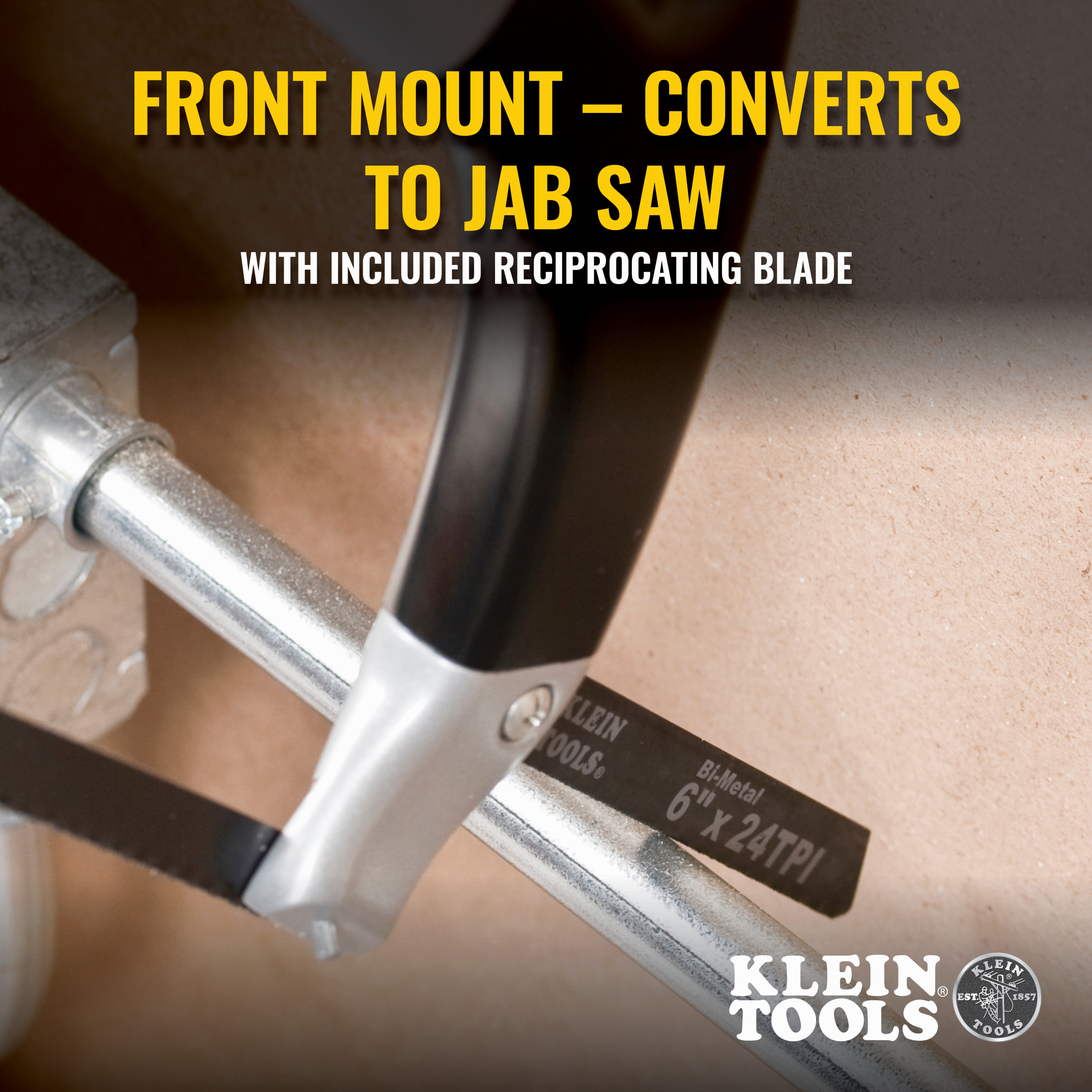 Klein Tools 12-Inch (30 cm) High-Tension Hacksaw has adjustable blade tension up to 30,000 Pounds Per Square Inch for fast, precise cuts. Includes 12-Inch (305 mm) x 24 Teeth Per Inch bi-metal hack saw blade and 6-Inch (152 mm) x 24 Teeth Per Inch bi-metal reciprocating saw blade. Also has convenient blade storage in handle and soft touch grips.
