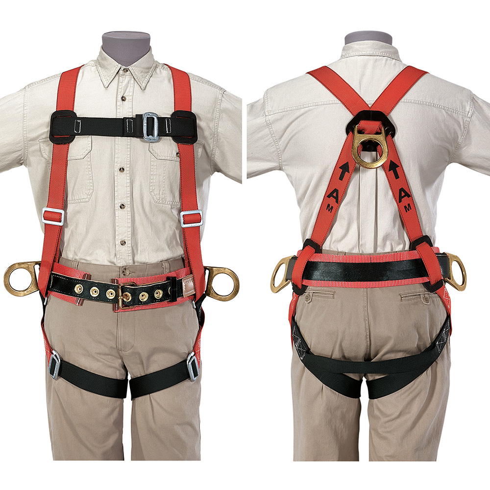 • Fall-arrest/positioning harnesses are designed to arrest free falls and distribute impact forces over thighs, pelvis, chest and shoulders as required by OSHA.