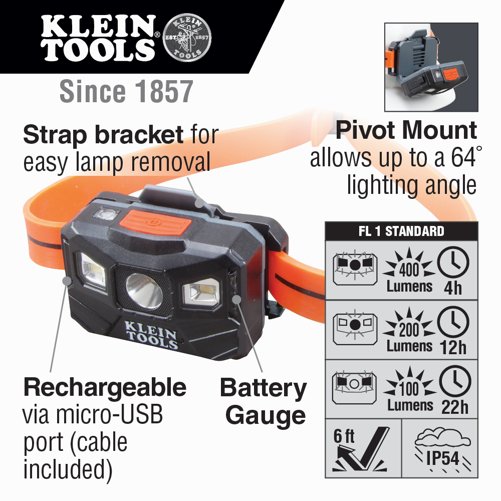 Klein Tools' rechargeable headlamp provides three modes to fit your task: a bright, 22-hour floodlight; a brighter 12-hour focused spotlight, and a super-bright 400 lumen boost mode. You'll know when it's time to recharge the lamp, because the battery gauge clearly indicates how much battery you have left. Whether you wear with the adjustable silicone strap or attach it directly to a Klein Tools Hard Hat, this rechargeable headlamp is the best choice for your everyday light.