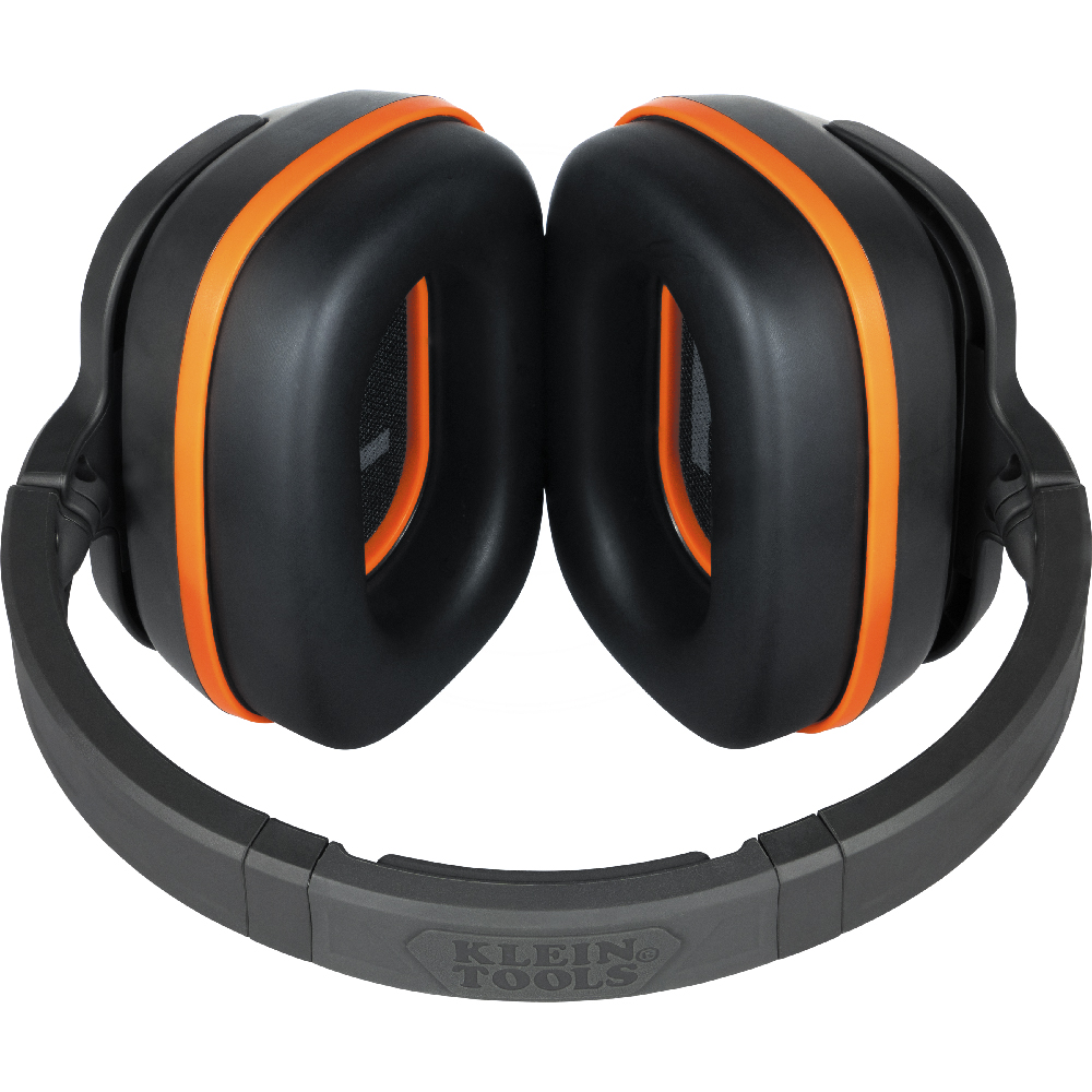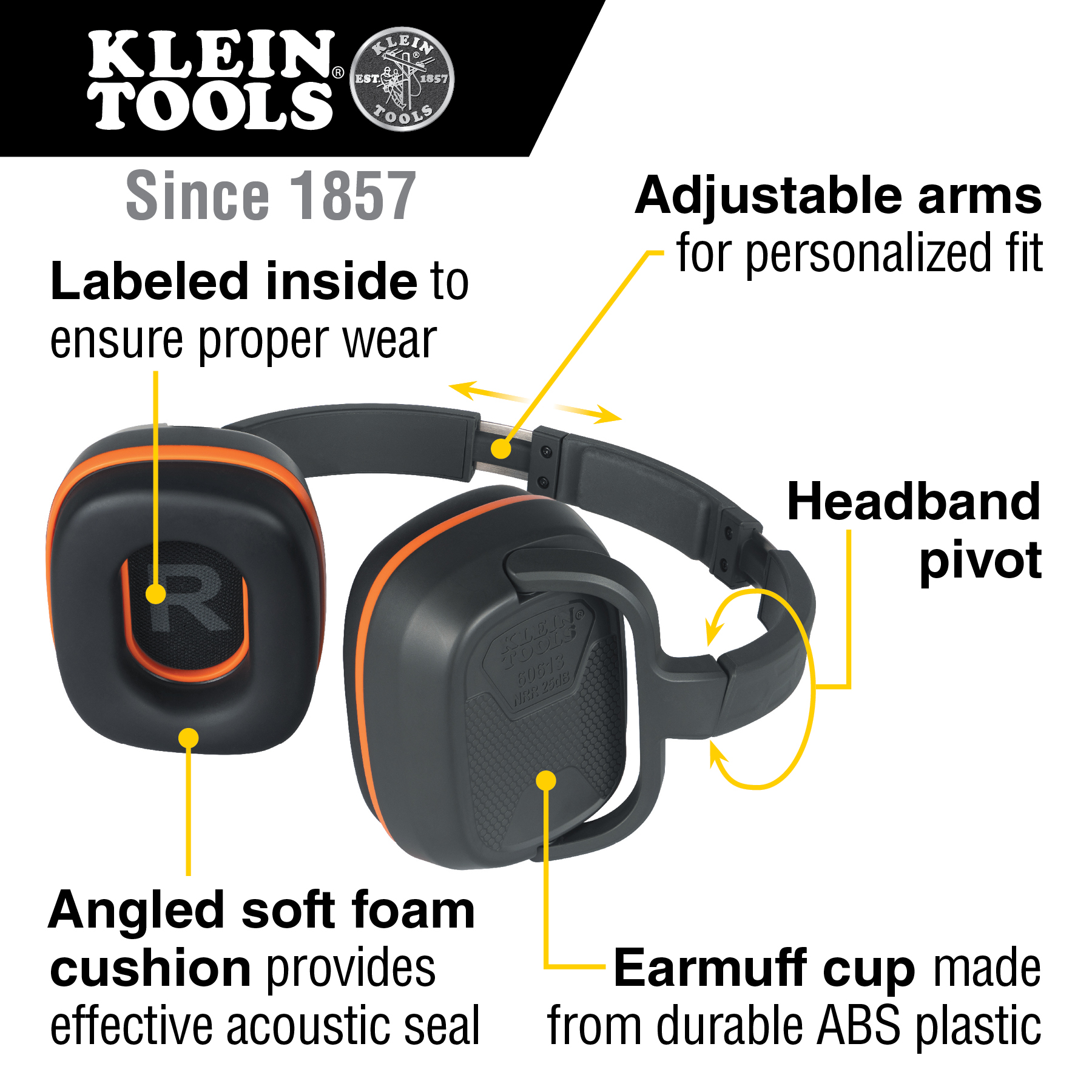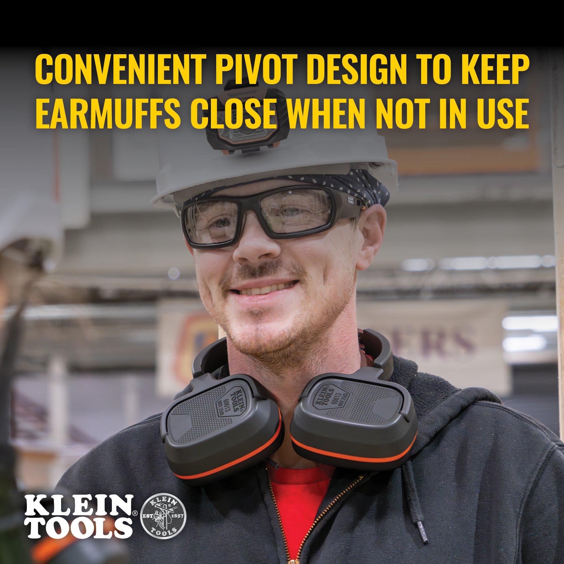 The Klein Tools Behind-the-Head Earmuffs feature a unique, versatile headband that allows for use with a variety of head protection. The angled, soft foam cushions provide an effective acoustic seal combined with an adjustable headband allowing for a personalized fit. When not wearing the earmuffs, pivot the earmuff cups to comfortably wear around the neck to keep them within reach.