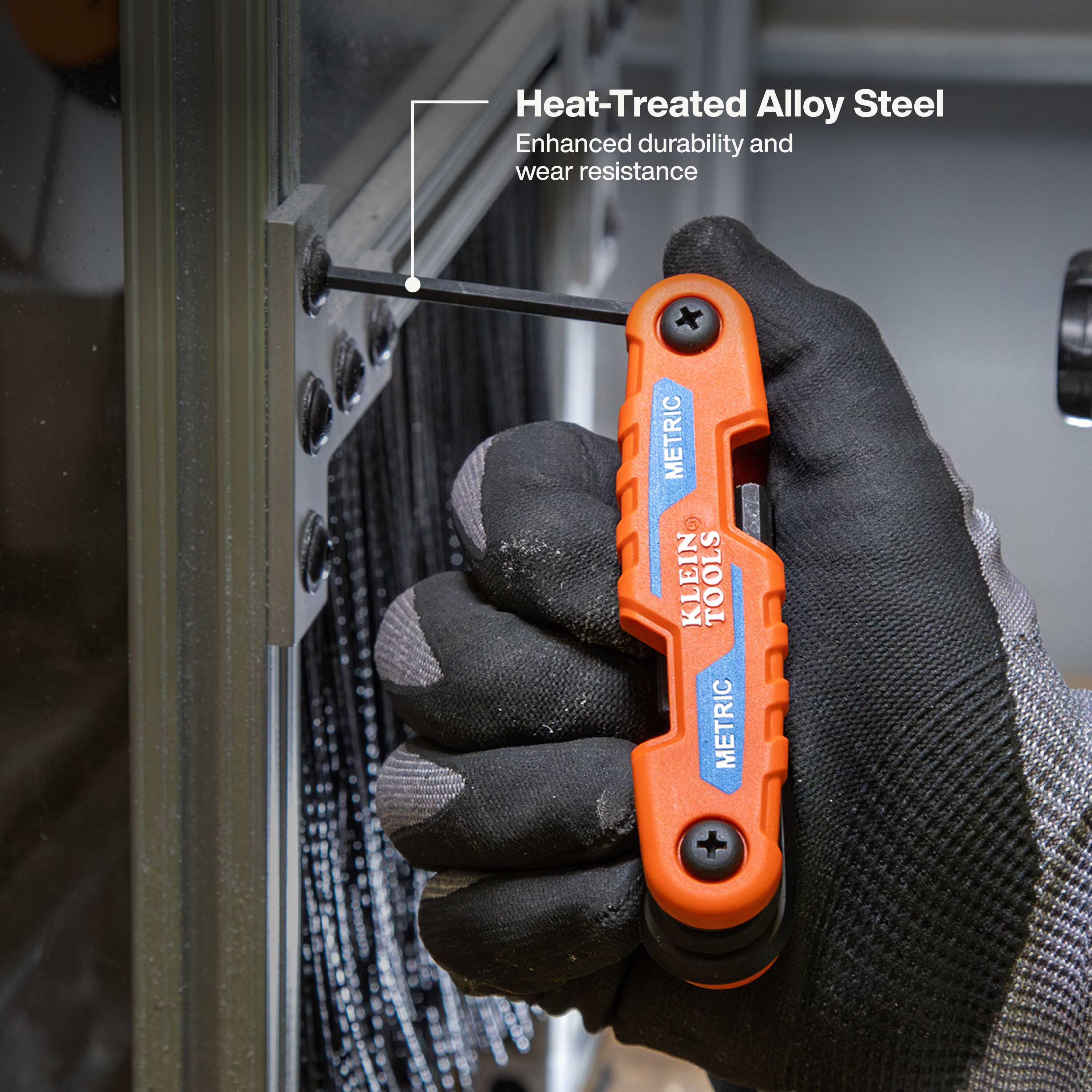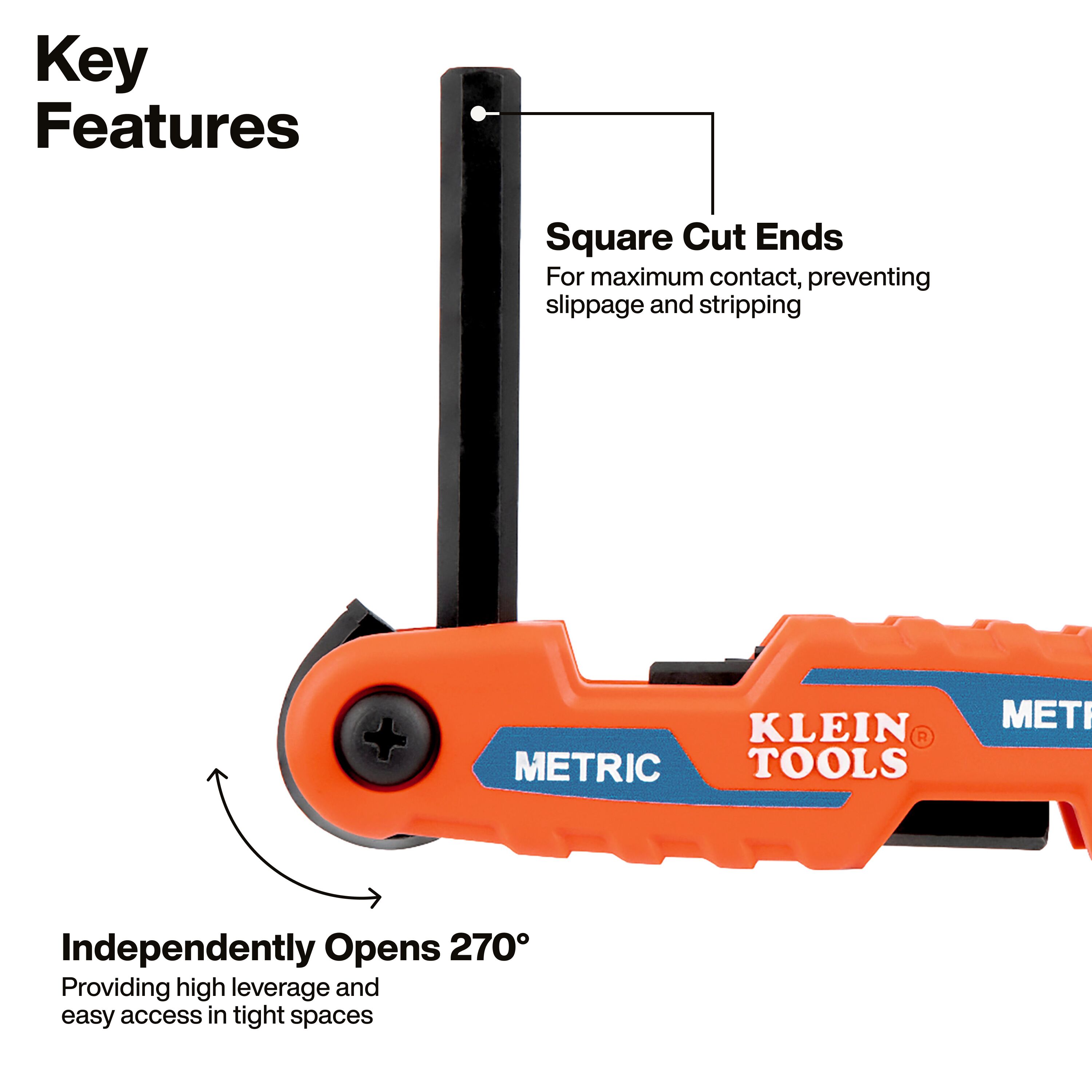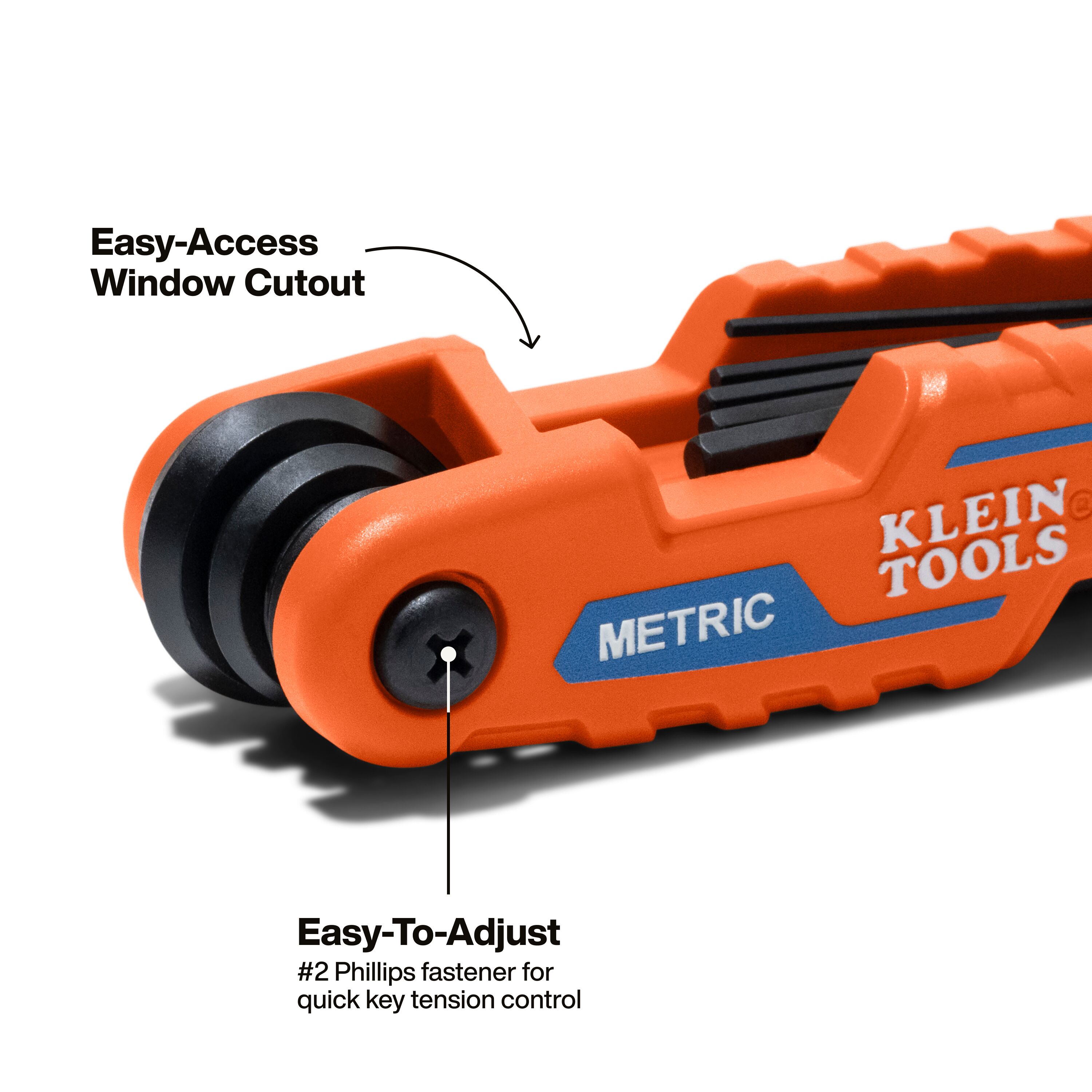 Klein Tools' new Compact Folding Hex Key line features the same highly durable reinforced nylon handle with easy key access but is now pocketable for more convenient storage and carrying. Our hex key sets feature a strategically placed #2 Phillips fastener on the outer body, ensuring effortless adjustment of key tension to suit your preference. Klein Tools' hex sets are color-coded for quick identification: red for Inch, blue for mm, and green for Torx®, enhancing efficiency.
