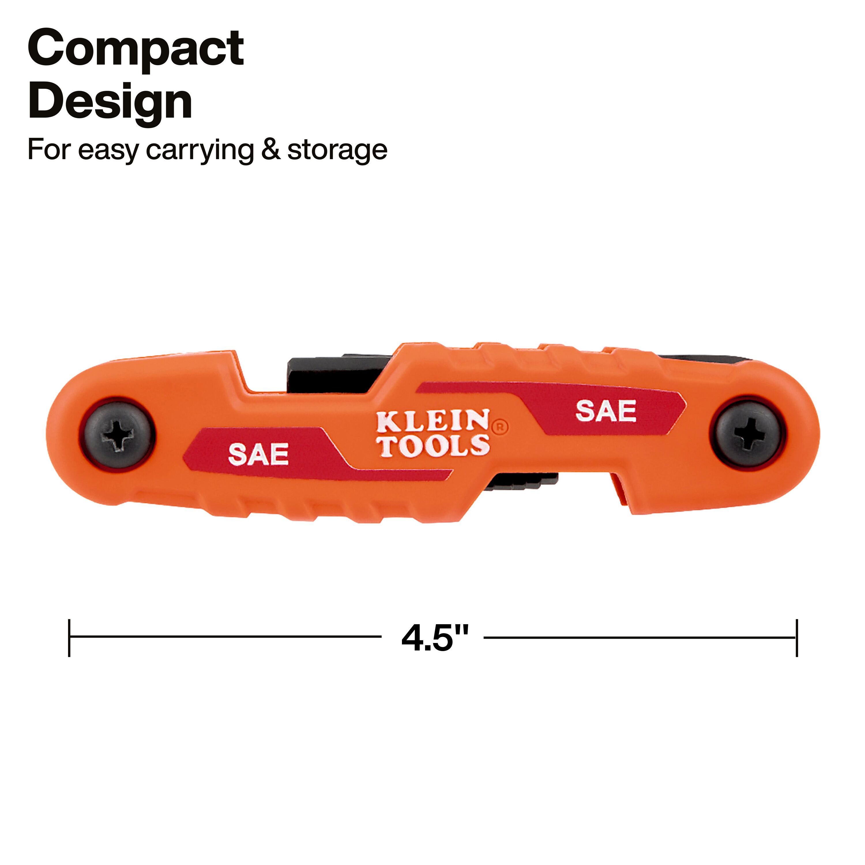 Klein Tools' 9-Key Folding Hex Key Set conveniently consolidates the most popular SAE sizes into one compact handle. The industrial strength, extended reach blades open independently up to 270 degrees, and a precision fit design to reduce slippage and stripping. The durable handle is made of reinforced nylon with a comfortable grip.