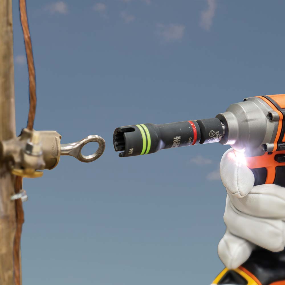 Klein's 3-in-1 Flip Impact Socket features an alignment slot to tighten and loosen most pole hardware. The 9/16-Inch and 3/4-Inch flip socket combines two of the most common socket sizes into one tool. The high-torque, 12-Point design is easier to position and works with square fasteners.