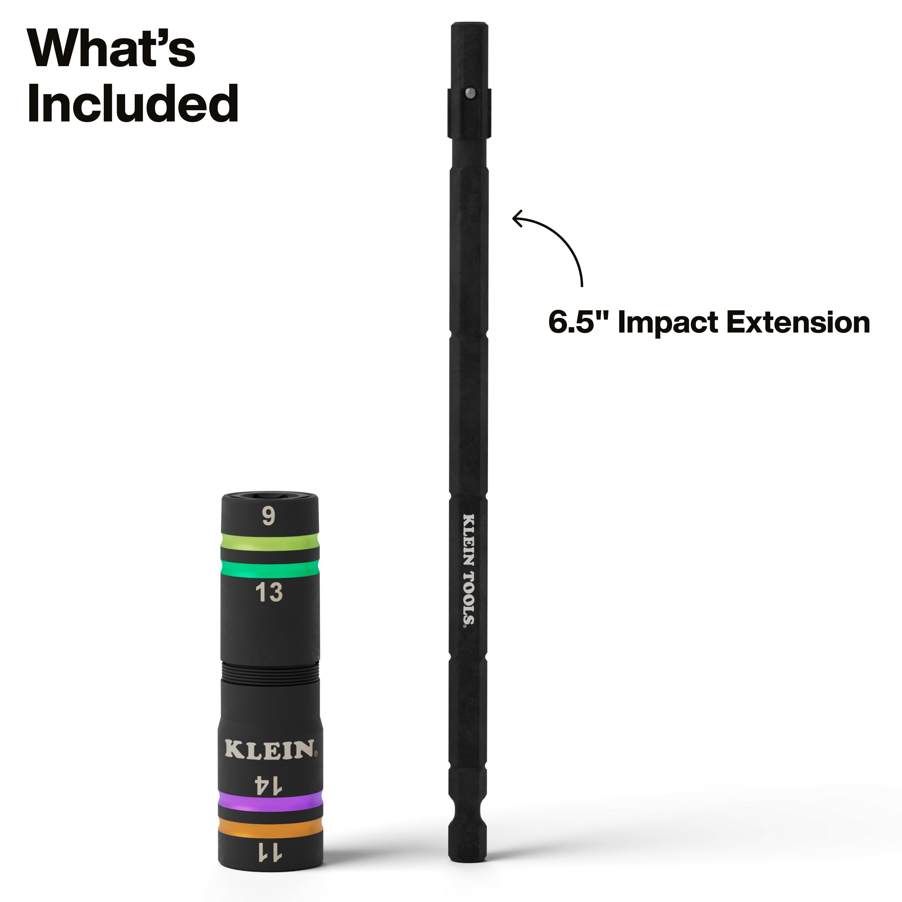 The Quad-4 impact flip socket combines four metric hex sizes in one color-coded socket. Access 9mm and 13mm hex sizes, then flip to use 11mm and 14mm. Spring-loaded action enables hands-free size changes. Includes 6-1/2-Inch storage shaft for organization and quick hex size transitions on the job.