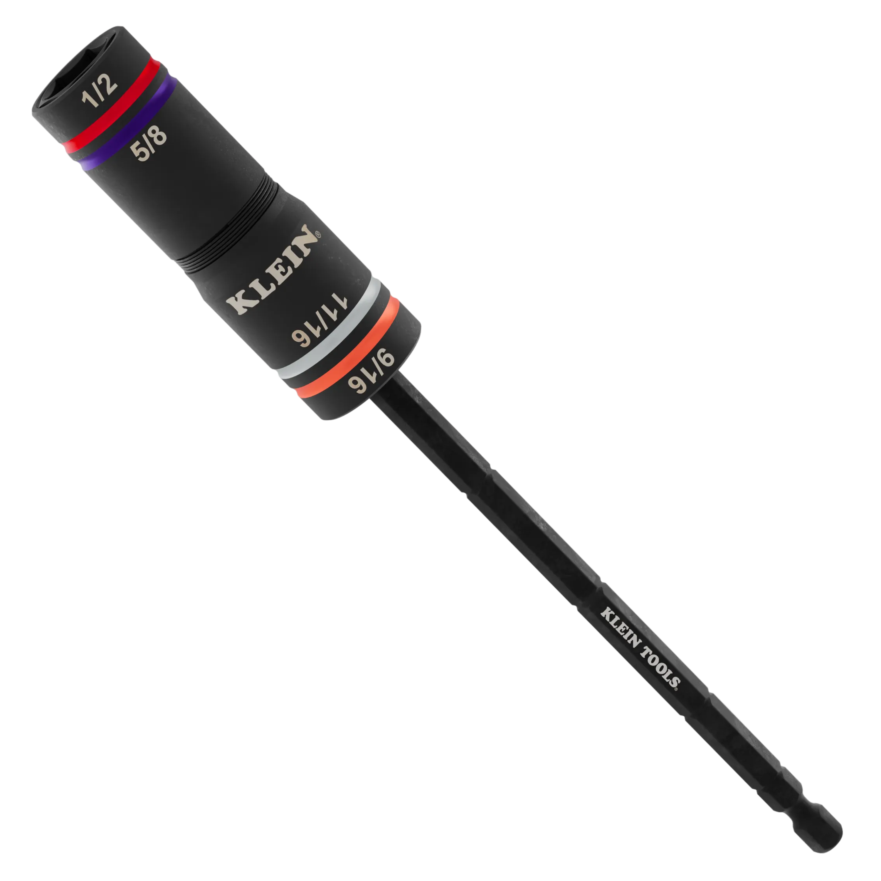 The Quad-4 impact flip socket combines four SAE hex sizes in one color-coded socket. Access 1/2-Inch and 5/8-Inch hex sizes, then flip to use 9/16-Inch and 11/16-Inch. Spring-loaded action enables hands-free size changes. Includes 6-1/2-Inch storage shaft for organization and quick hex size transitions on the job.
