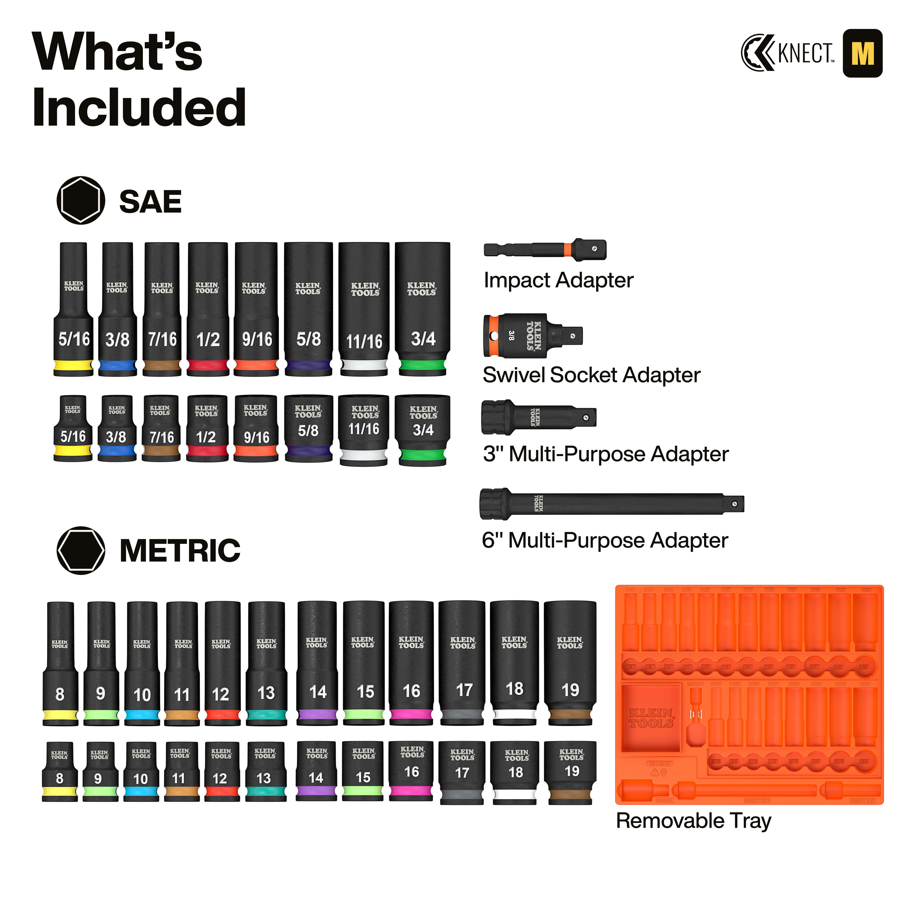 3'' and 6'' KNECT™ Extension, 1/4'' Hex to 3/8'' Square Adapter, Swivel Adapter, (8) Deep and Shallow SAE Sockets, (12) Deep and Shallow Metric Sockets, Removable Tray