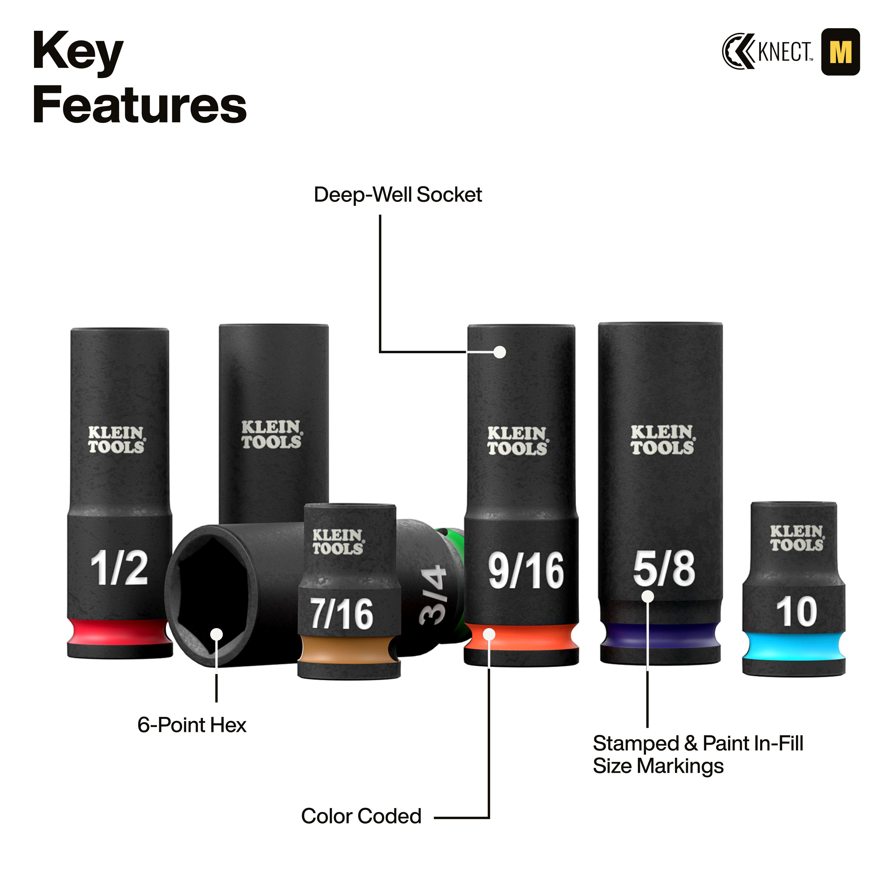 - Long lasting, industry-standard color-coded painted rings and bold stamped size markings with high contrast white paint infill to quickly identify socket sizes
