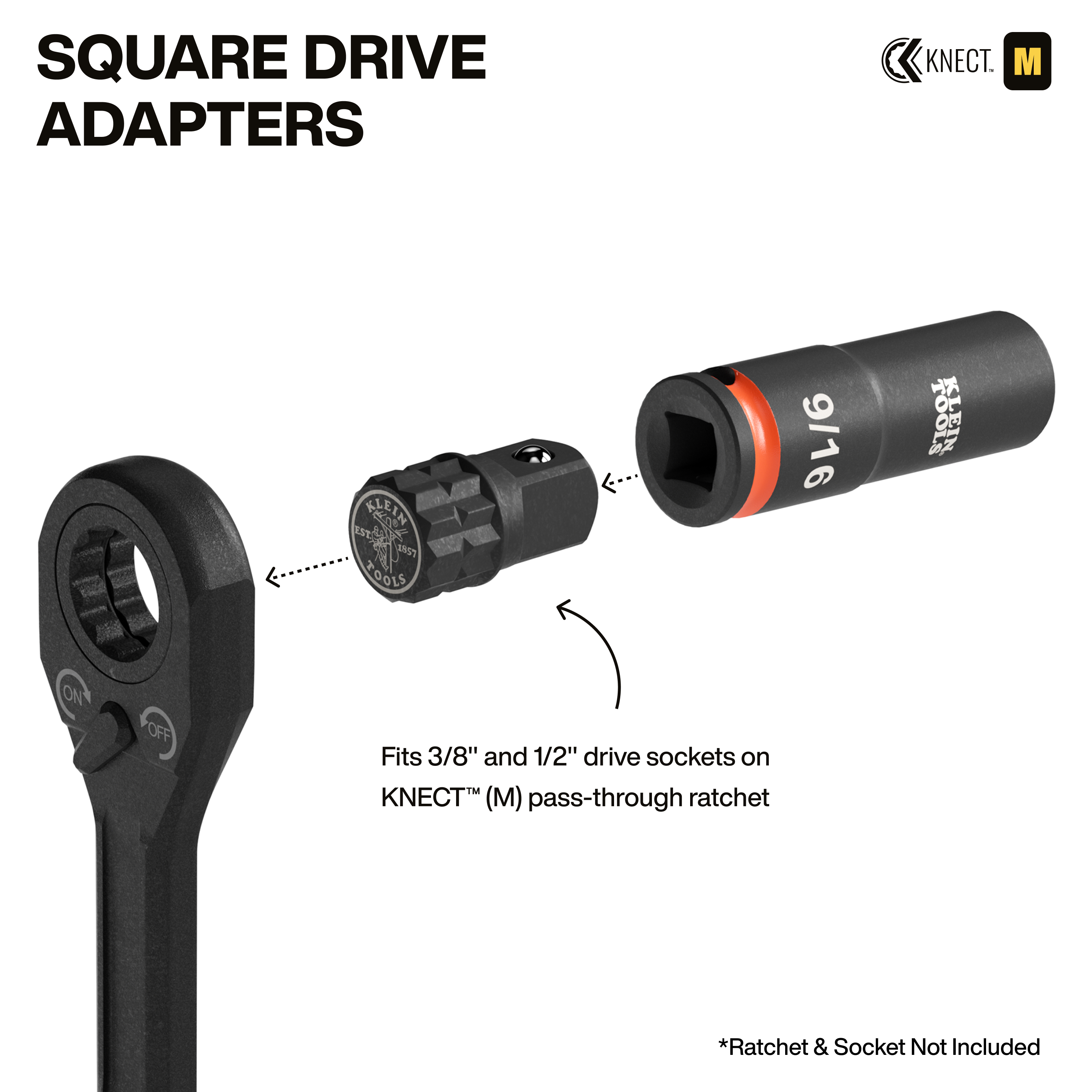 • Square drive adapters allow traditional sockets to be used on the KNECT™ (M) pass-through ratchet