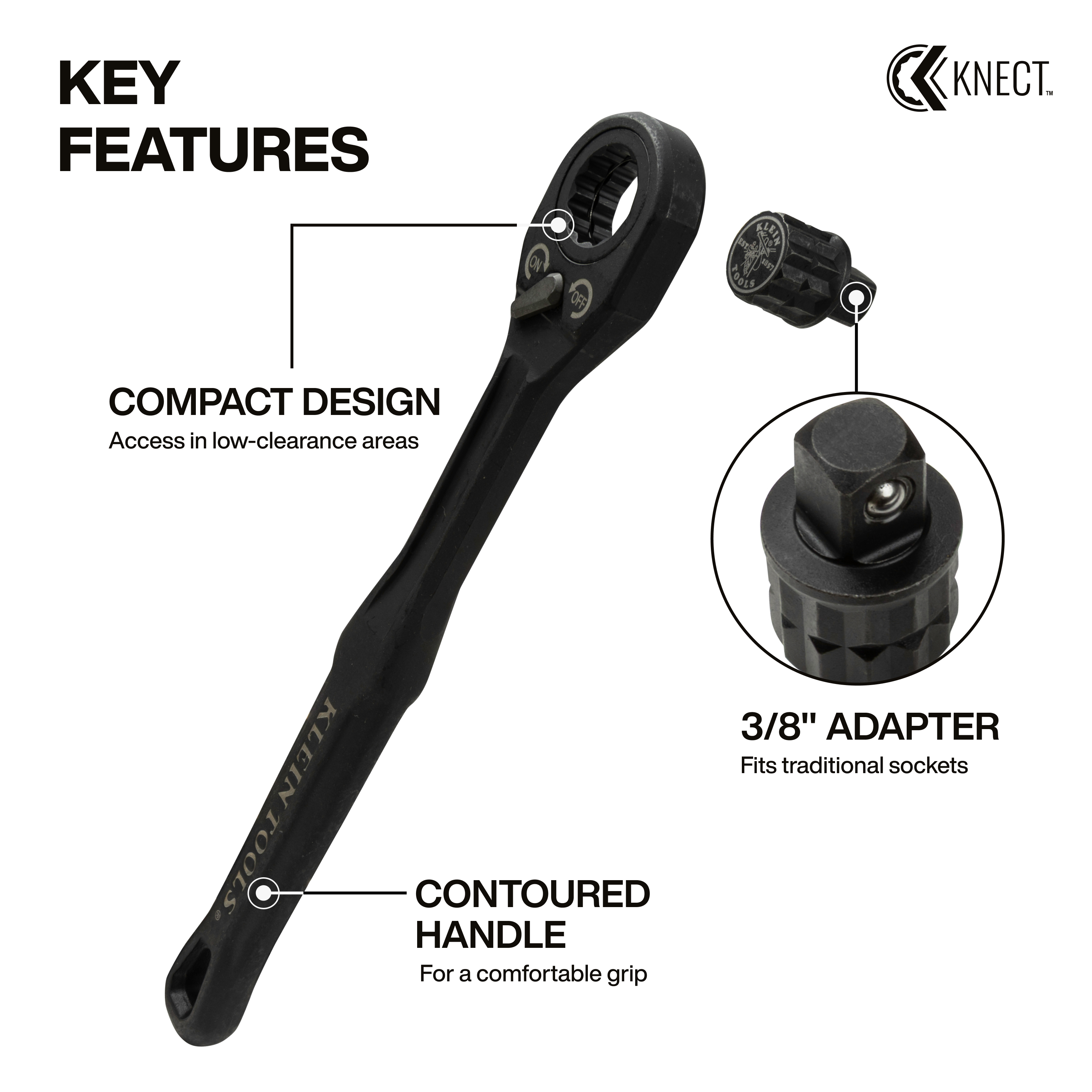 The KNECT™ (M) 90-tooth pass through ratchet is perfect for driving hex nuts on extended threaded rods. The included 3/8-Inch square drive adapter ensures compatibility with traditional sockets, making it a must-have for any toolbox. Its compact design allows easy access in tight spaces, while the contoured handle provides a comfortable grip.