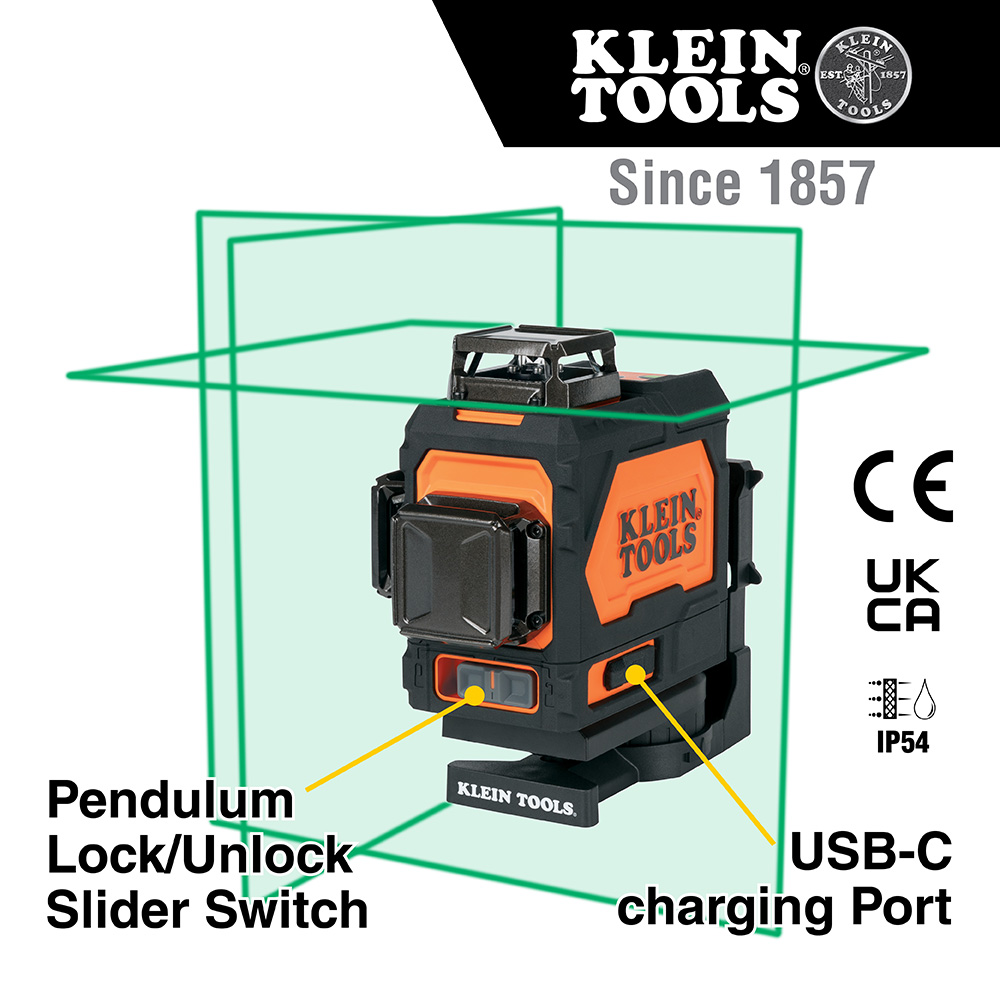 The Klein Tools Rechargeable Self-Leveling Green Planar Laser Level is a high-performance laser leveling and alignment tool for professionals. Clear, bright green 360-Degree lines in the X-, Y-, and Z-planes project from this level, and offers plumb up and plumb down marks. Equipped with an integrated magnetic mount and 1/4-Inch-20 tripod mounting threads, Klein's self-leveling laser level is more precise than a traditional spirit or box level, and enables a multitude of alignment.