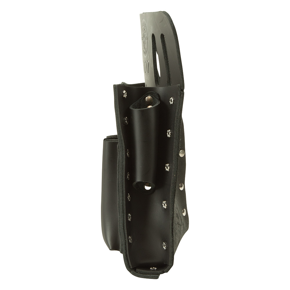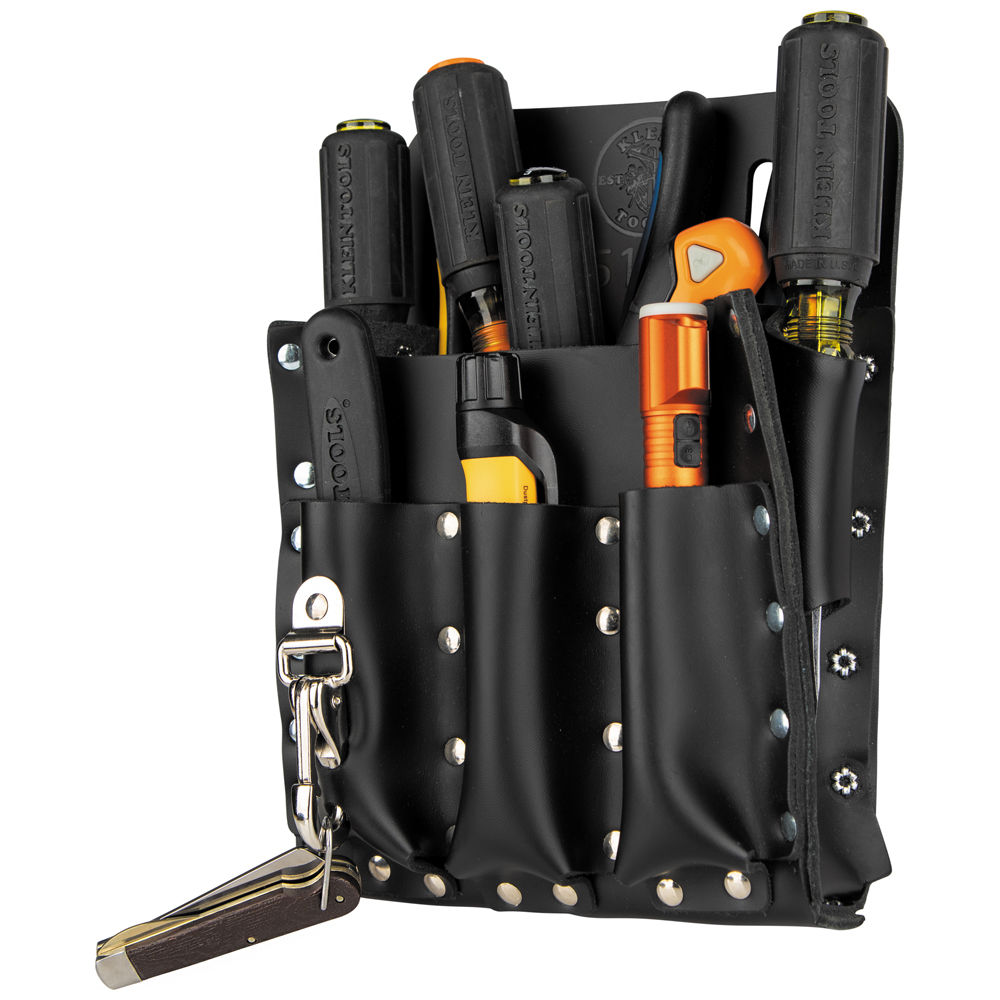 This Klein Tools 6-Pocket Leather Tool Pouch features rivet reinforcement to promote longer life. In addition to the 6 pockets, the pouch has a knife snap holder. The pouch is designed to conveniently attach to a belt for ready access to items.