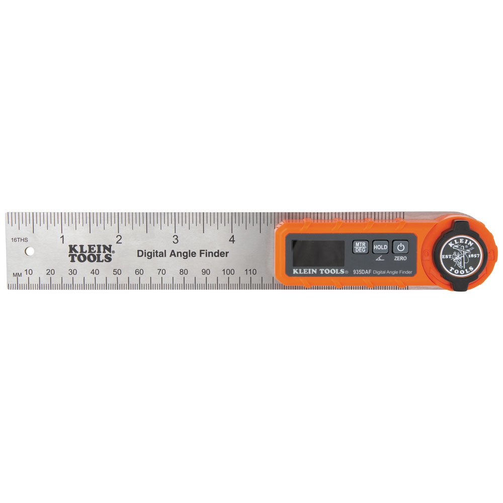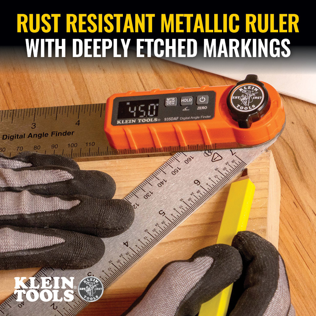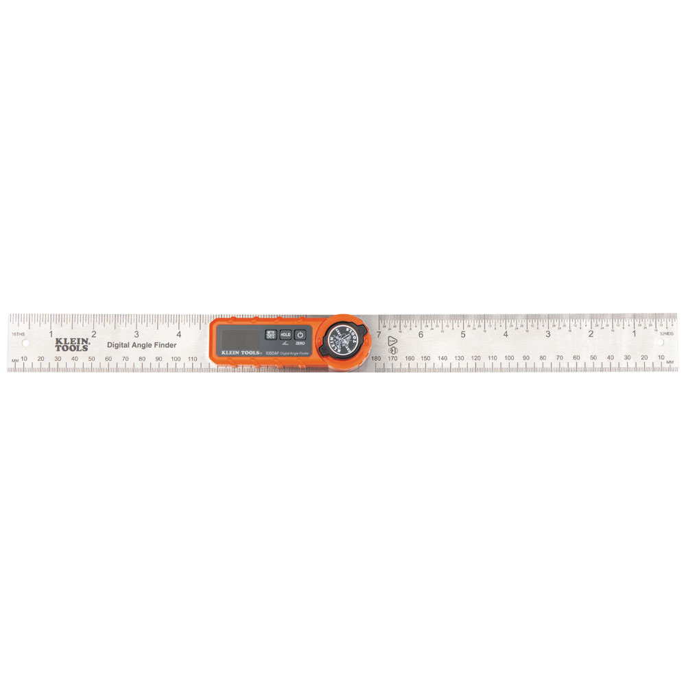 Klein Tools' Digital Angle Finder provides precision measurements for inside and outside angles, lengths, and calculates miter saw angles. It offers best in class accuracy of +/-0.2-Degree for quickly finding any angle and calculating the miter saw blade angle to ensure miter joints are cut to a perfect fit. The compact design with a single AAA battery and premium reverse contrast display allows for easy tool box storage and can be carried around in pockets.