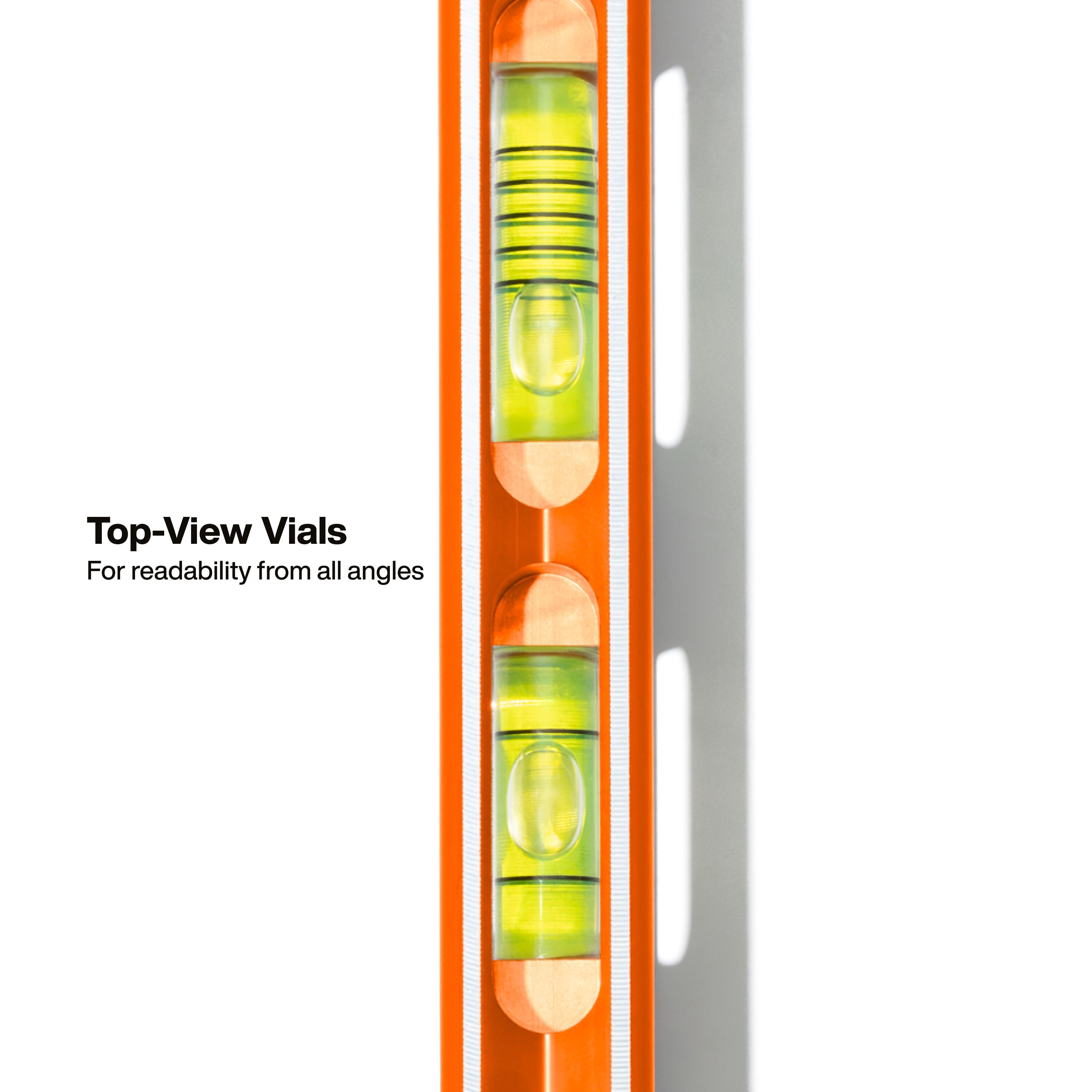- Large top view vial windows enable easy readability from multiple angles and enhance usability during overhead work or in confined spaces
