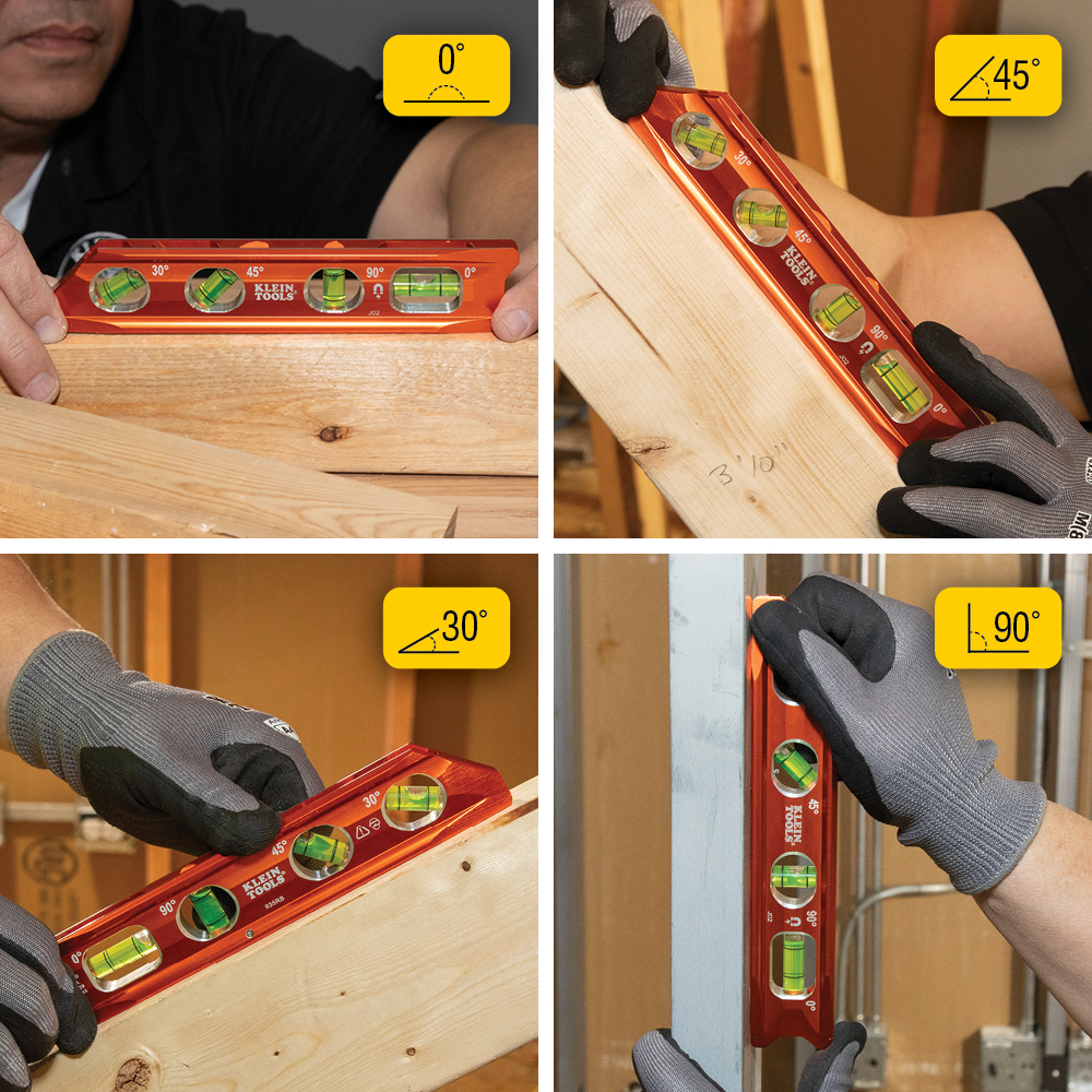 - Large, easy-to-read high-visibility vials at 4 angles: level, 90, 45, and 30 degrees