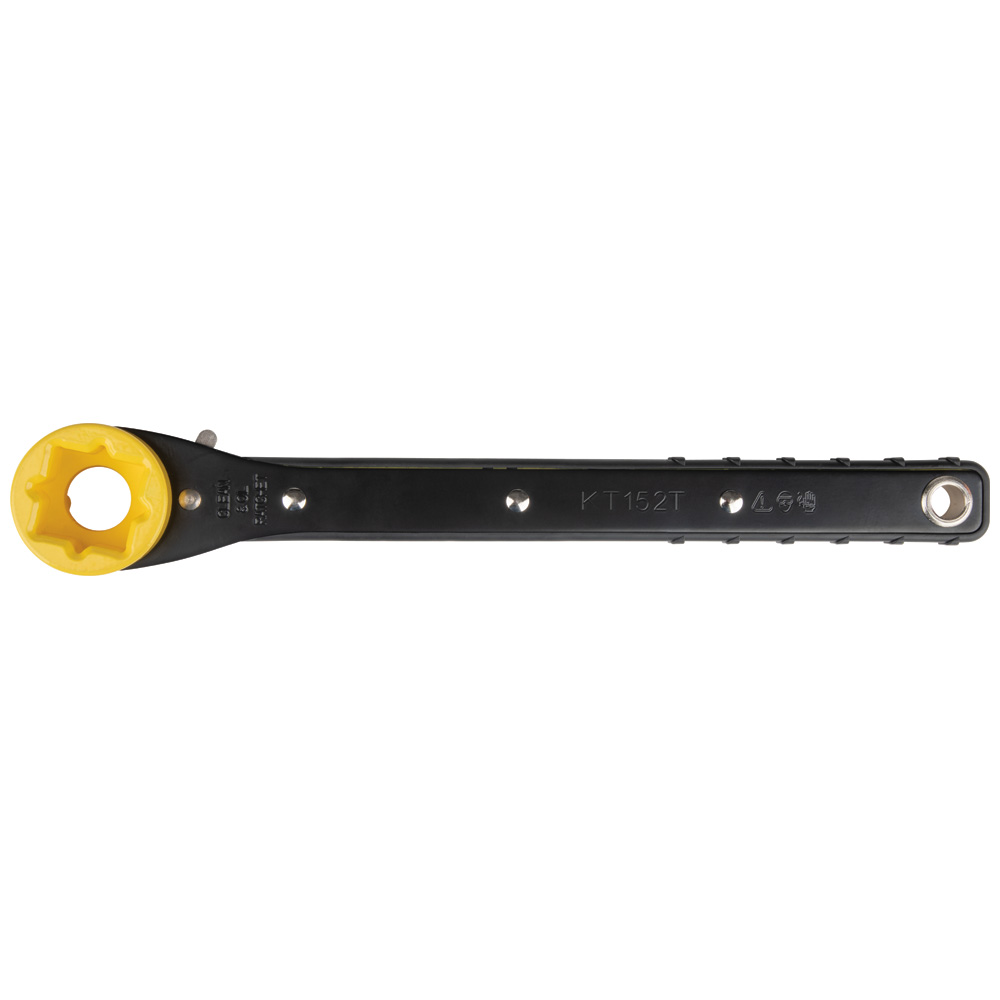 The Slim Ratcheting Lineman Wrench works on four different square sizes, covering all of the common utility pole hardware. The long handle provides plenty of leverage and a tight ratcheting mechanism increases efficiency. The high visibility yellow socket includes a bolt-through design, enabling use on long bolts. Handle is fully integrated for durability.