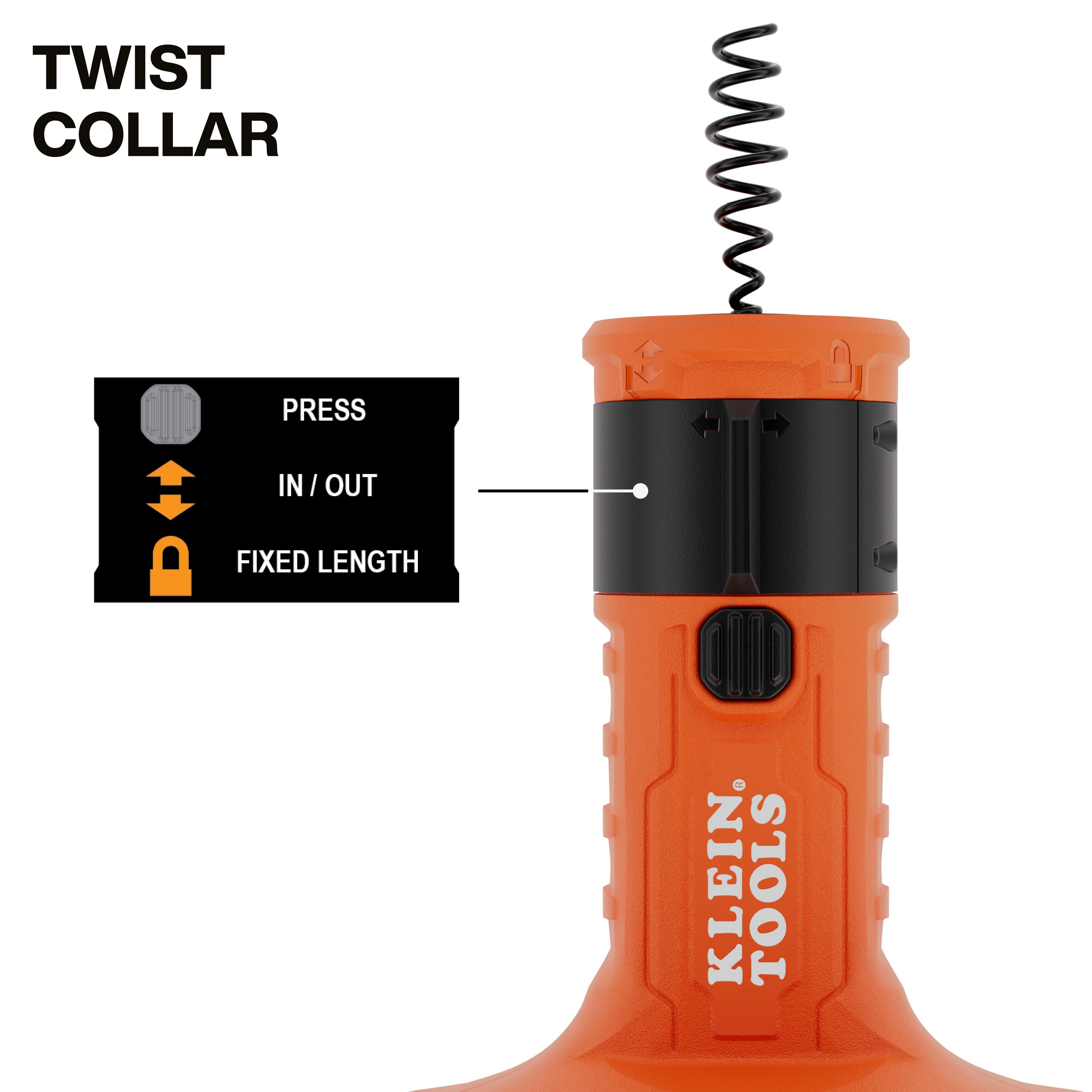 Klein Tools 25-Foot Auto-Feed Drum Auger features a tri-roller automated payout and hybrid drill compatibility. The folding handle locks securely for manual operation then folds for drill use and compact storage. The twist collar provides control between payout and retract modes, while the fixed mode keeps the coil firmly locked in place. Built for professional plumbers demanding efficiency and reliability in drain snake applications.