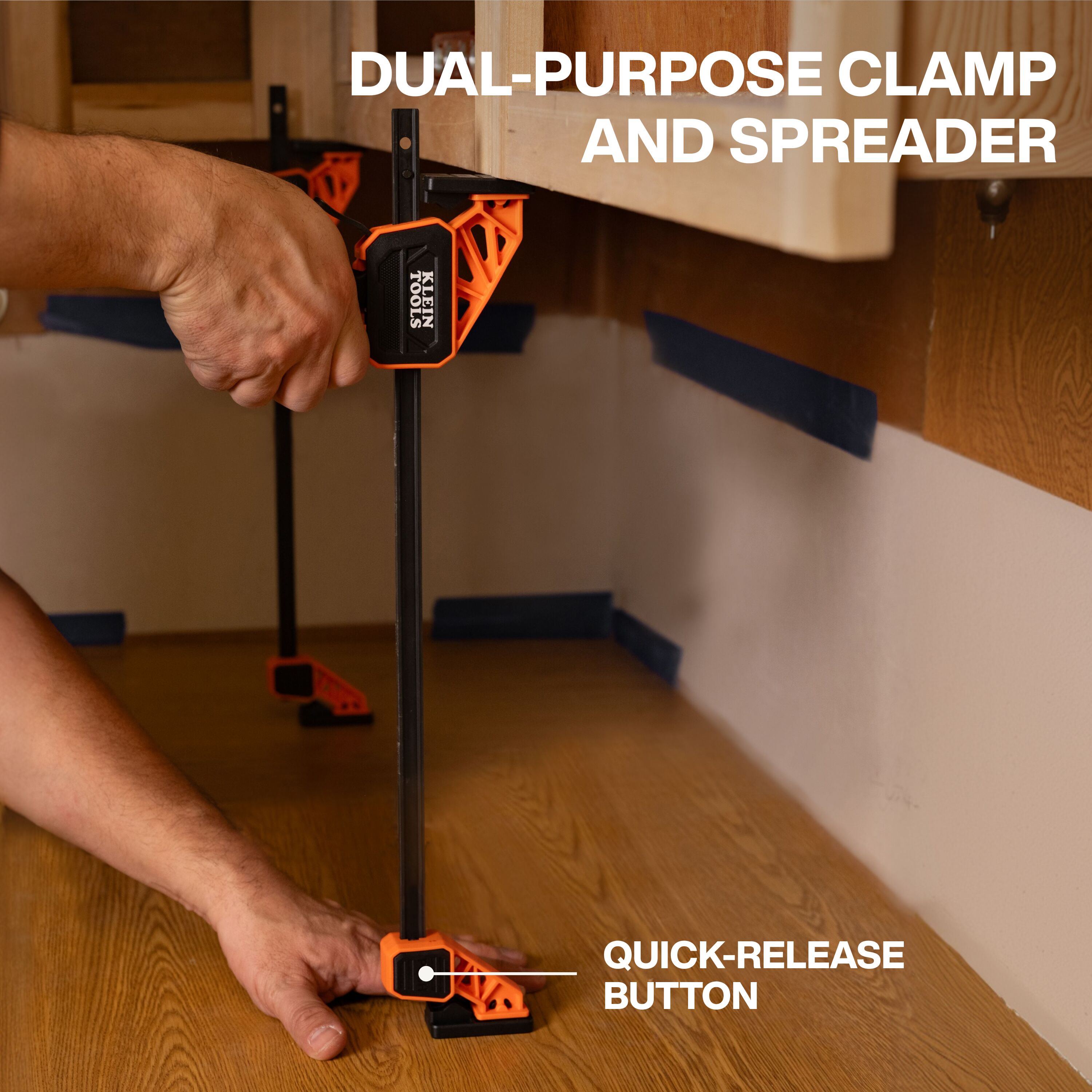 Klein Tools Speed-Klamp 12-Inch clamps deliver quick one-handed operation with 150-Pound clamping force. Pads pivot and detach to accommodate various surfaces, ensuring a secure grip. Dual-purpose functionality converts the clamp into a spreader for expanded use across woodworking and metalworking applications.