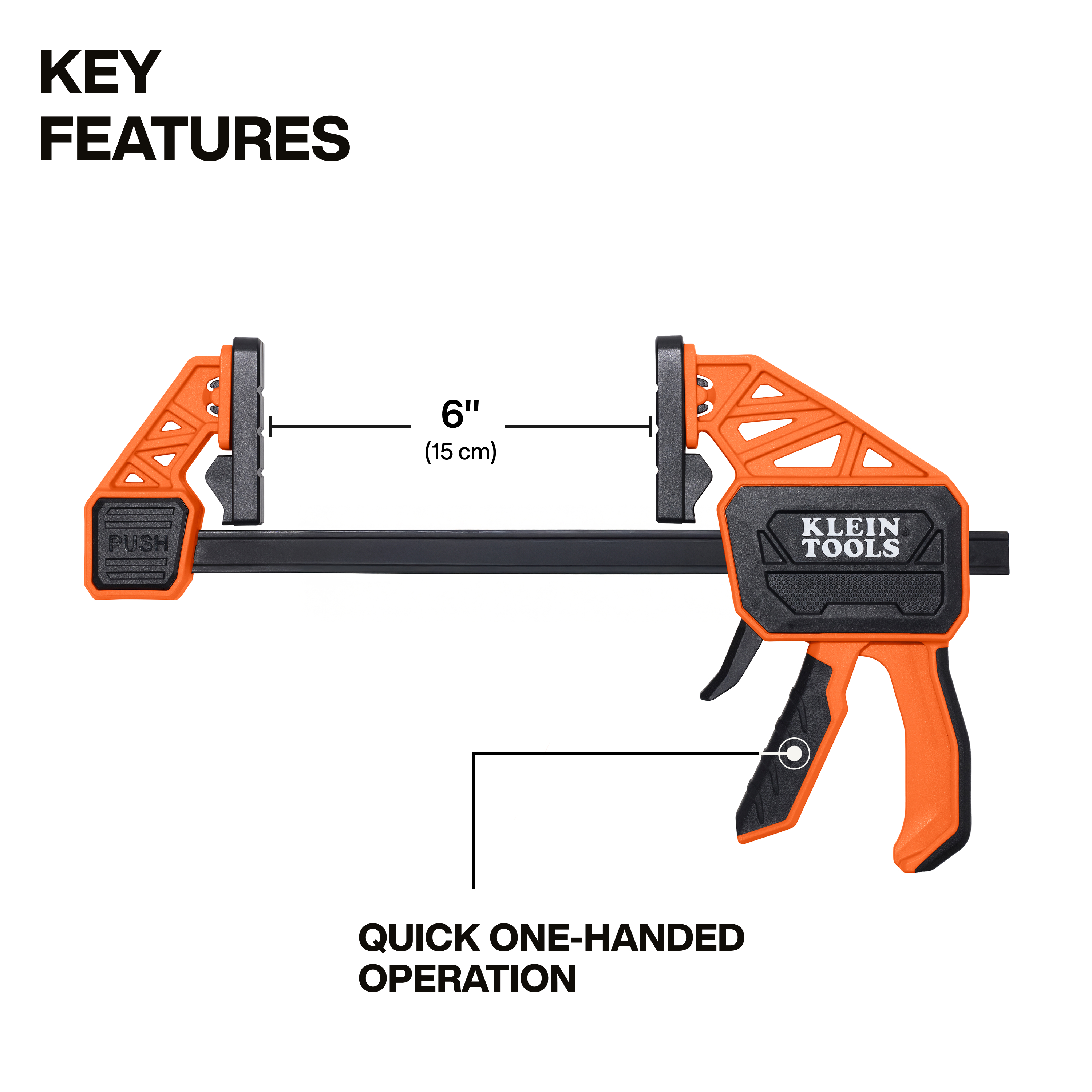 Klein Tools Speed-Klamp 6-Inch clamp delivers quick one-handed operation with 300-Pound clamping force. Pads pivot and detach to accommodate various surfaces, ensuring a secure grip. Dual-purpose functionality converts the clamp into a spreader for expanded use across woodworking and metalworking applications.