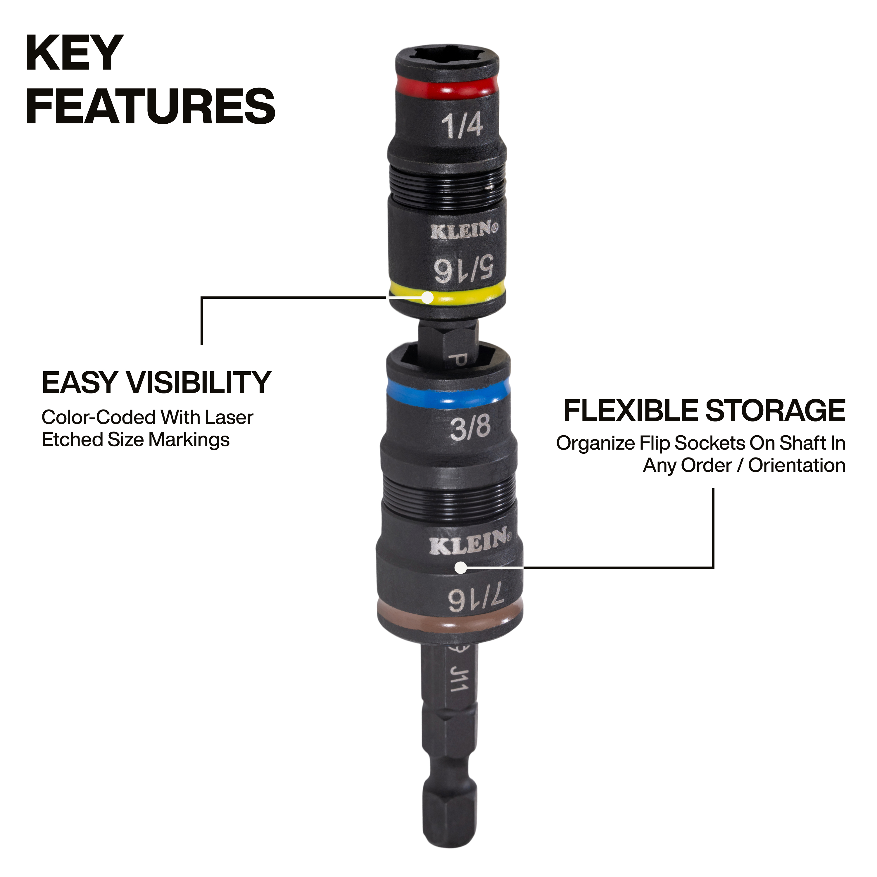 - Flip sockets can be stored in any order or orientation on the shaft